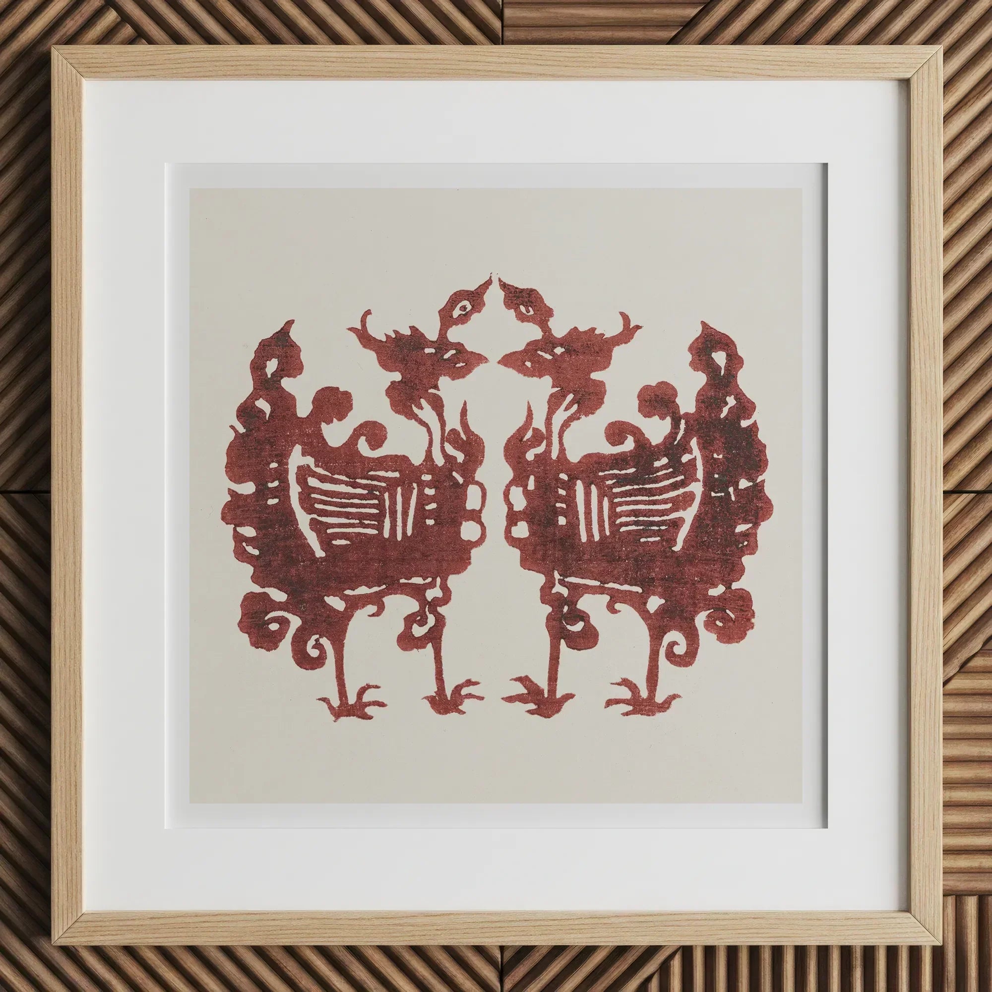 Immerse yourself in the mesmerizing symmetry of Taguchi Tomoki's Yatsuo no tsubaki woodblock print. This Japanese masterpiece captivates with its bold, russet-hued avian forms, mirrored in perfect harmony. You'll be drawn into a world where mythical birds perch on stylized branches, their elongated necks intertwining in an ethereal dance.