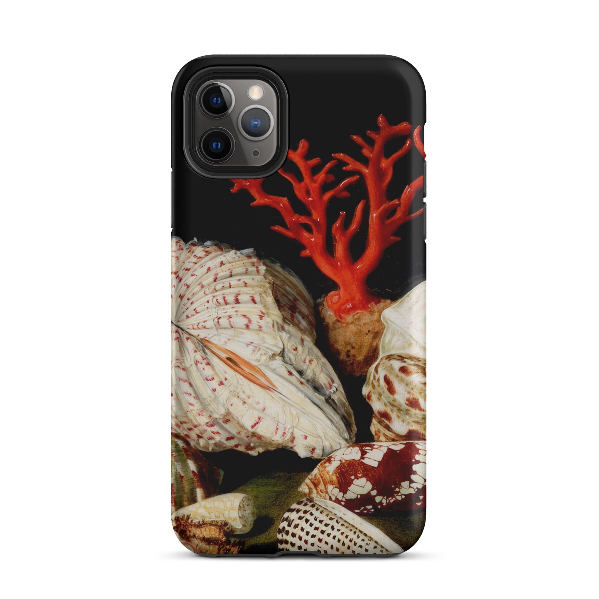 Jacques Linard’s Baroque still life shimmers on this iPhone case like an altar to oceanic memory—red coral antlers rise from a velvet black void, flanked by shells inked in natural calligraphy, each form caught mid-whisper between taxonomy and trance.