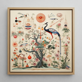 A dream unfurls—somewhere between an ancient scholar’s ink-washed scroll and a future where biology bends to the logic of stars. Here, a crane stands like a celestial envoy, its plumage edged in spectral blue, its body a delicate contradiction of precision and poetry. Around it, the world hums with impossible symmetries—trees knot themselves into fractal constellations, their branches cradling orbs that glow like suspended eclipses. Every leaf, every feather, every filament-thin tendril whispers of a taxonomy that never was, an alien bestiary drawn not from Earth’s quiet logic, but from the fevered imagination of some cosmic cartographer.