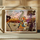 This eclectic surrealist print beckons you to explore its layered symbolism. A central figure, adorned in a patchwork of textures, stands sentinel over a world where nature and myth collide. Dreamlike seagulls dance with fantastical ferns, while miniature structures dot distant hills, hinting at hidden stories within this mystical dreamworld.