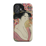 Cradle a slice of Edo-period enchantment with this iPhone case showcasing Utamaro's ukiyo-e masterpiece. A geisha's alabaster visage peeks coyly from behind a golden fan, her almond eyes hinting at untold secrets. Ebony tresses, adorned with gleaming kanzashi, frame her delicate features.