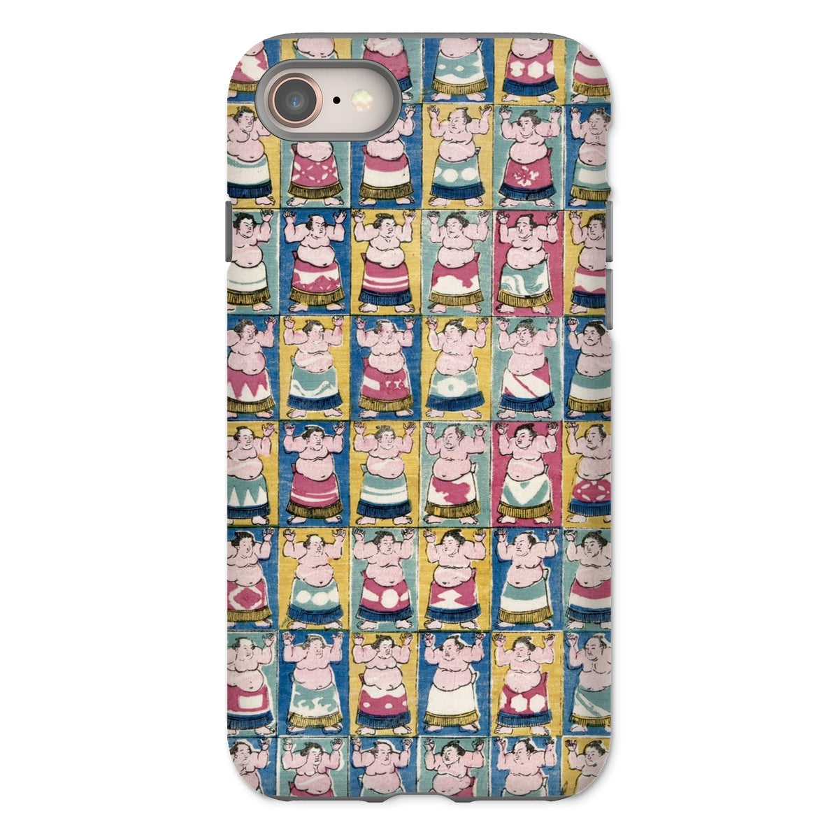 Your new Sumo Wrestlers iPhone case blends historical motifs with retro-modern appeal, paying homage to the whimsical charm of Utagawa Yoshikazu’s late-Edo period artistry. In the grid of sumo wrestler caricatures, each flexes exaggerated muscles in a merging of traditional ukiyo-e aesthetics with Pop Art sensibilities. Vibrant hues of red, yellow, blue, and green form a kaleidoscopic tableau, softened by a faded, vintage finish evocative of vintage prints and posters.