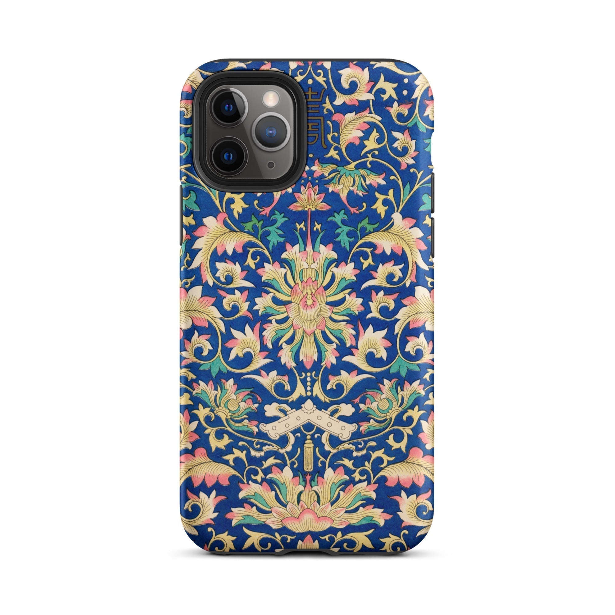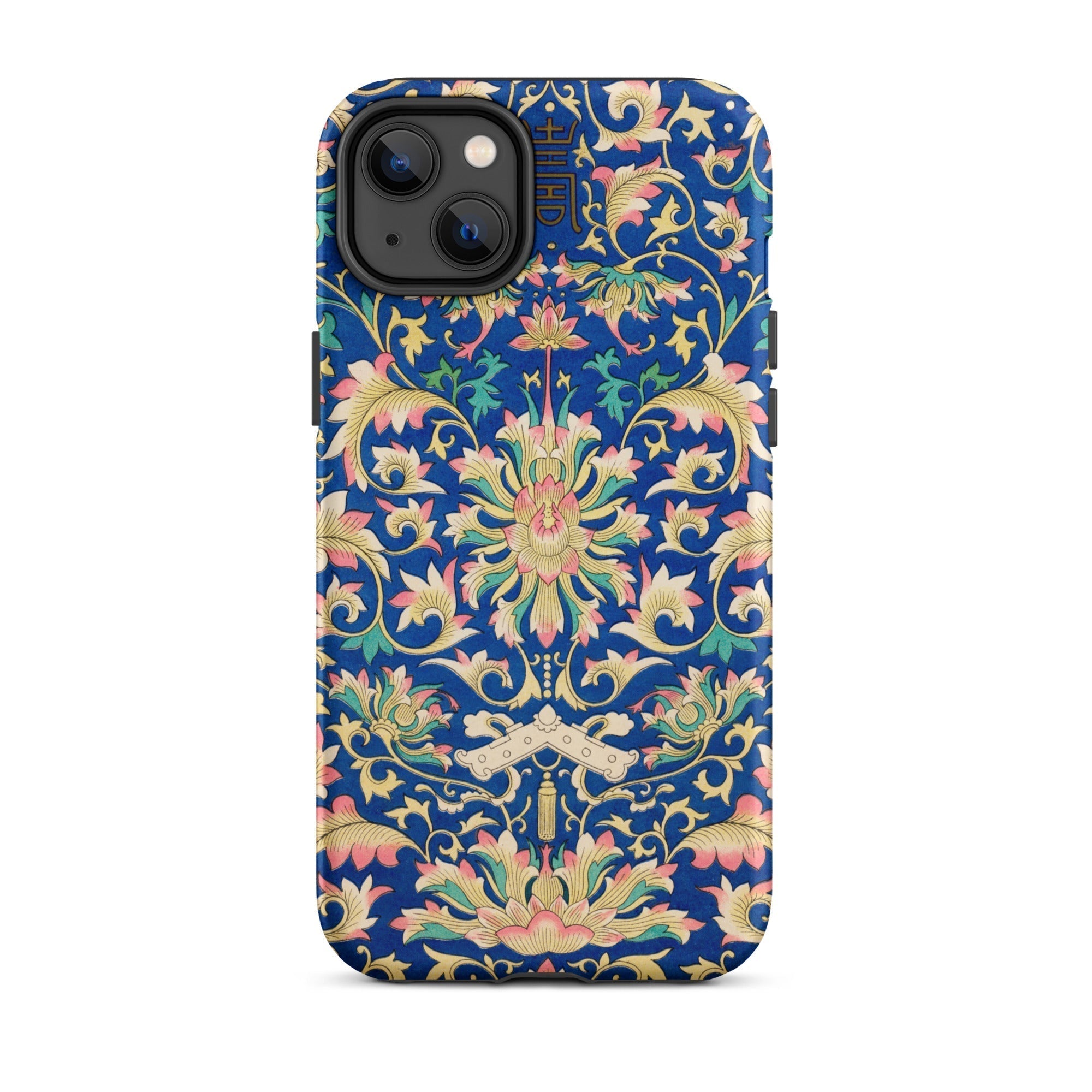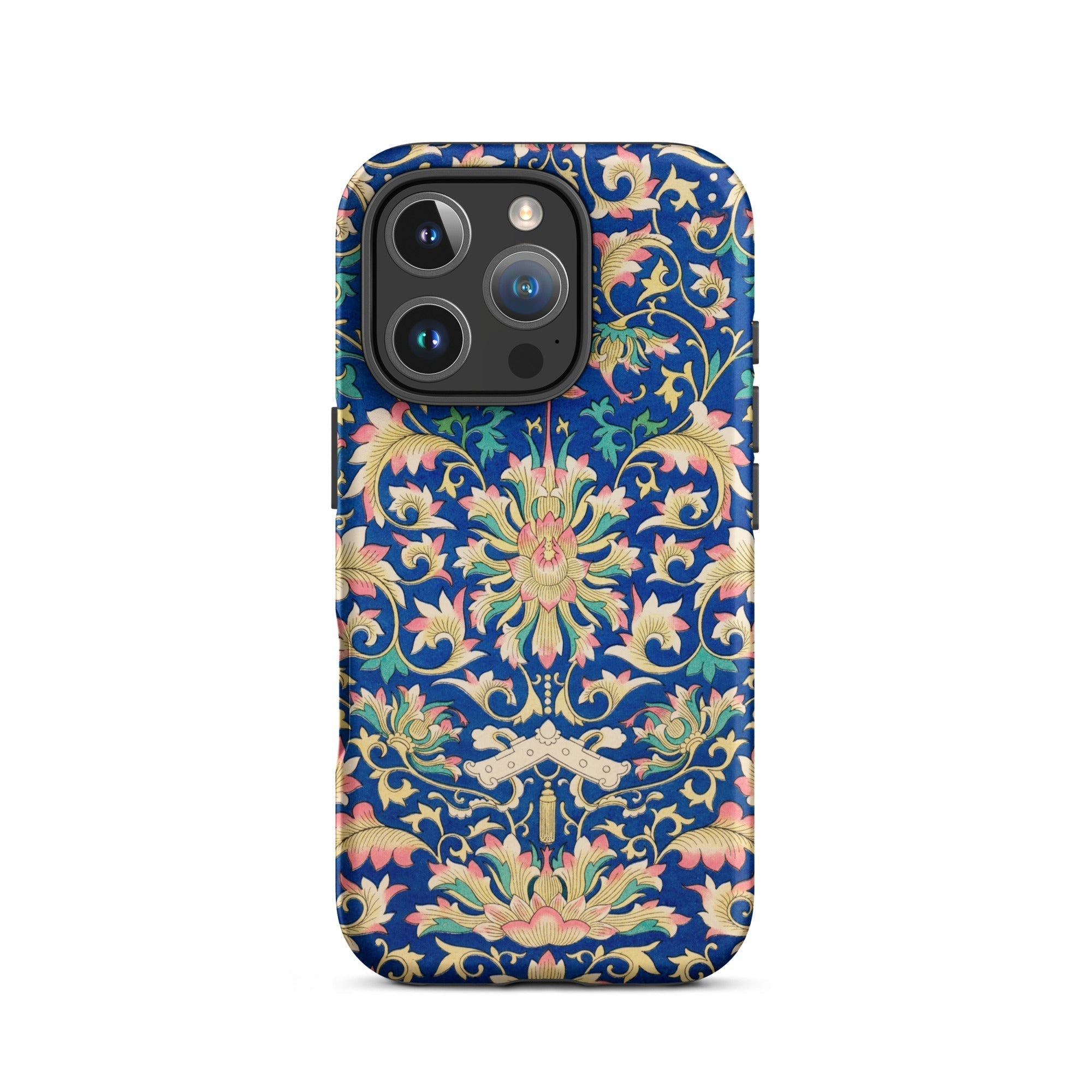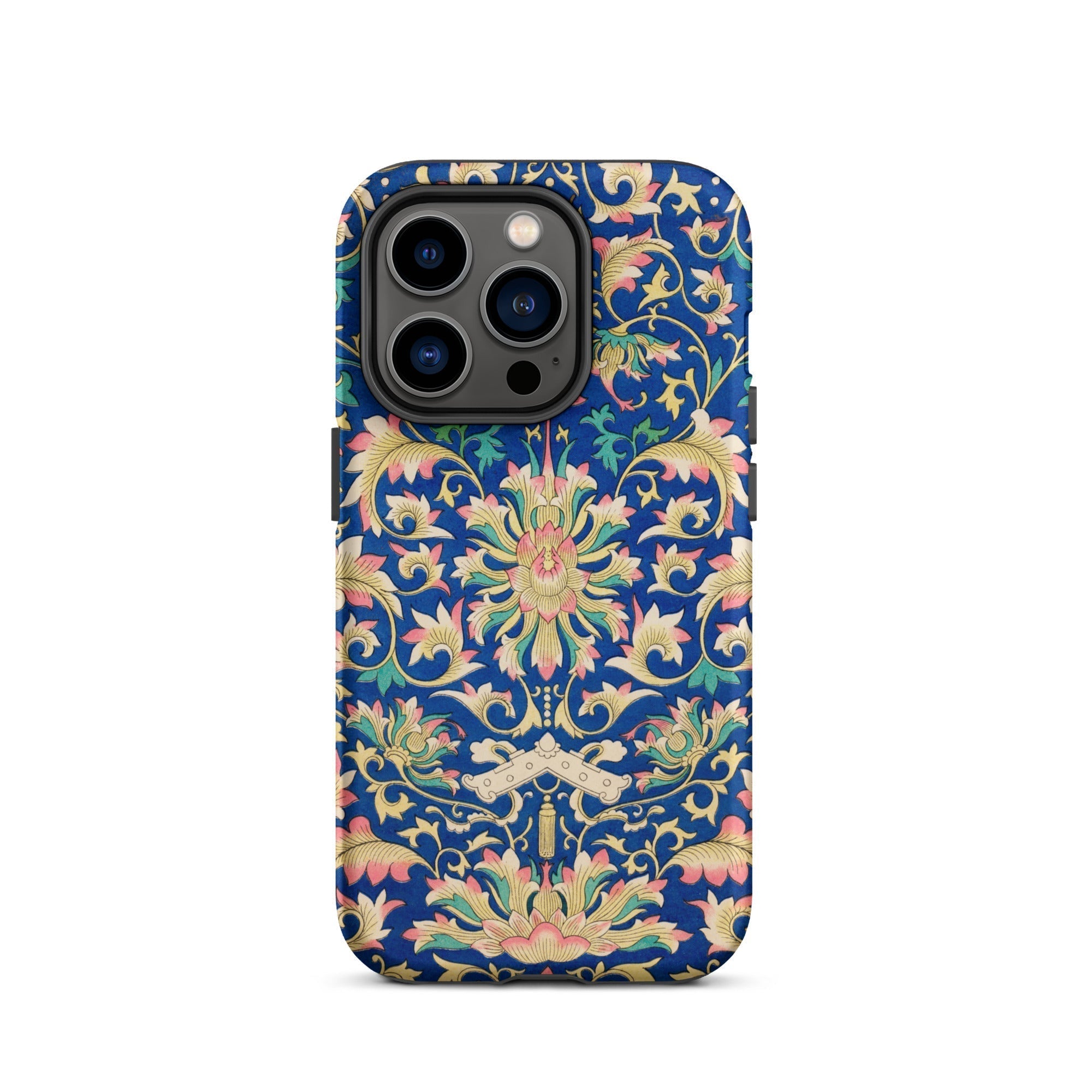 Plant yourself in Owen Jones's Chinoiserie-inspired iPhone case, a vibrant fusion of Victorian aesthetics and Eastern influences. This ornamental marvel showcases intricate floral patterns against a rich blue backdrop, echoing Jones's revolutionary chromolithography techniques. Delicate lotus blossoms and swirling acanthus leaves intertwine, creating a mesmerizing tapestry of cream, pink, and teal hues.