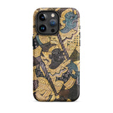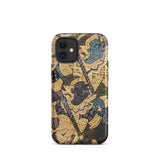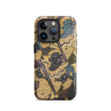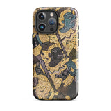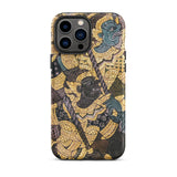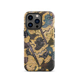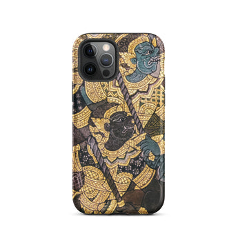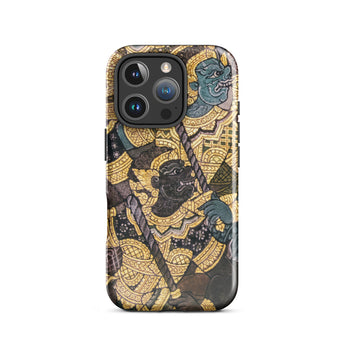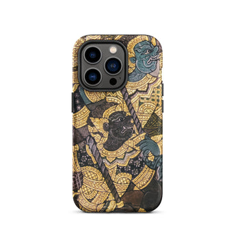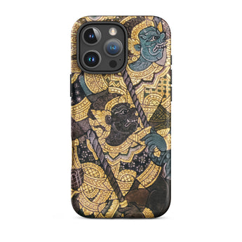 Wrap your iPhone in the mystique of ancient Thai artistry with this case featuring a spellbinding Ramayana battle scene. The fresco, a tour de force of Ayutthaya-era temple painting, explodes with mythological drama. Ochre-skinned warriors, their limbs adorned in shimmering gold leaf, clash spears beneath ornate crowns.