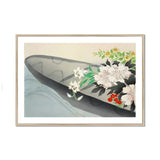 The hull is soft as moonlit lacquer. Bearing a drifting shrine of blossoms: tiger lilies arched like ivory swans, red chrysanthemums clustered like ritual embers, pale peonies smoldering beneath ash-black foliage. Their contours seem etched not in pigment, but memory. Ephemeral and exact.