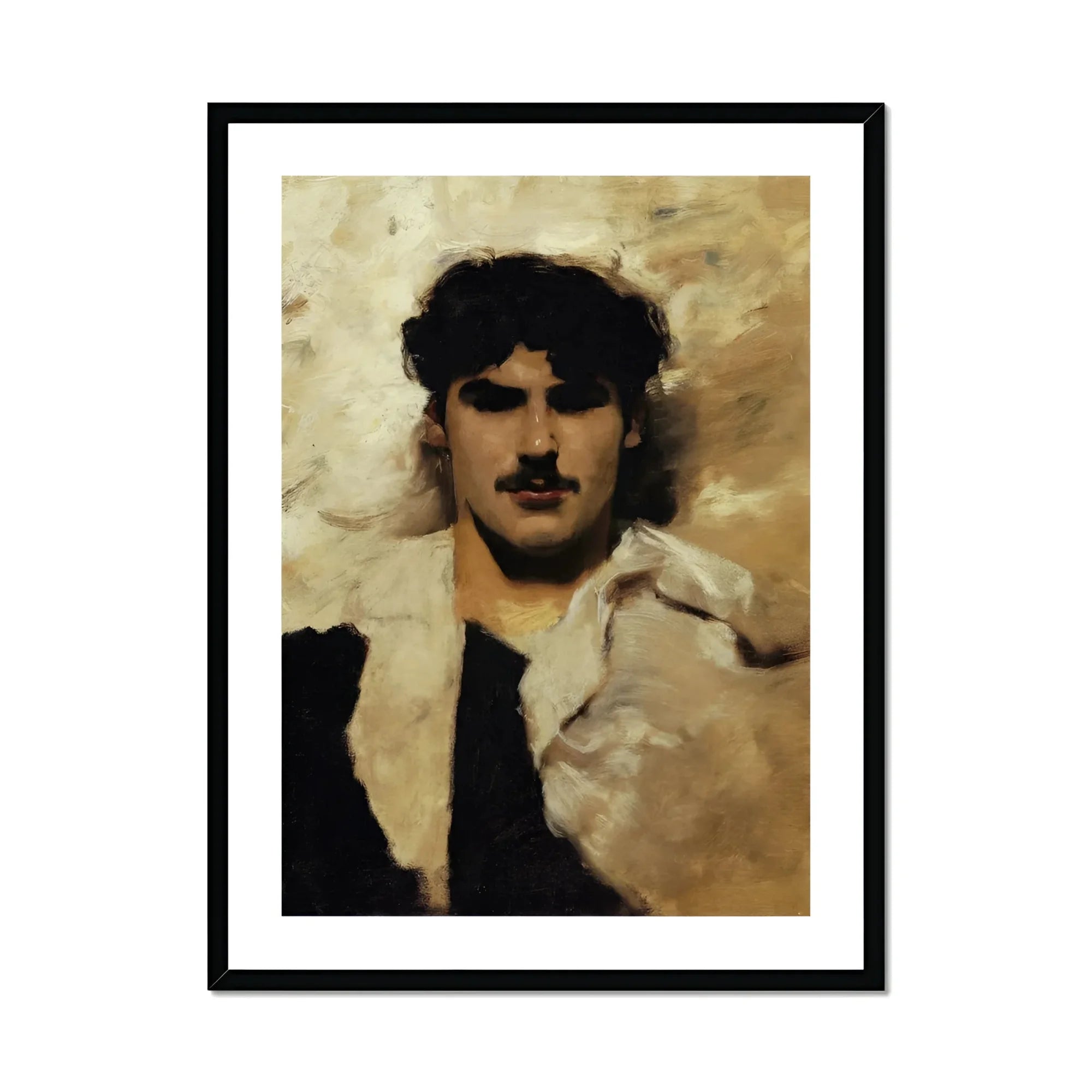 Sargent's Head of a Male Model is awash with raw talent. A virtuoso display of oil-on-canvas prowess that'll make your eyeballs dance. This isn't just a portrait; it's a manifesto of what paint can do when it's pushed to the limit. The model's face emerges from a maelstrom of ochre and umber, his dark eyes like twin black holes pulling you into their orbit. And that mustache — it's not just facial hair. It's a declaration of smoldering masculinity rendered in pigment.