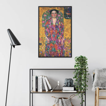 You'll be mesmerized by this framed canvas featuring Klimt's Portrait of Eugenia Primavesi. A tour de force of Viennese Secession artistry, where a floral fiesta meets sartorial splendor. Primavesi's steadfast gaze pierces through a whirlwind of polychromatic petals, her garment a patchwork paradise of jewel-toned blooms.