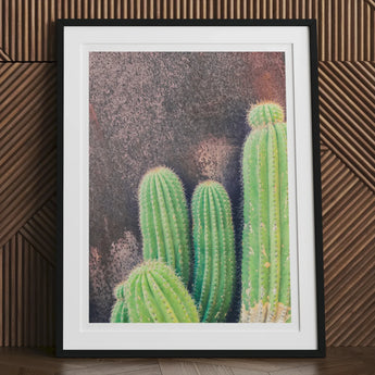 Embark on a spiky adventure with this desert drama. Vibrant columnar cacti burst forth, their emerald spires defying a gritty, textured backdrop like nature's graffiti artists. This print captures the raw essence of survival, transforming your space into an urban oasis.