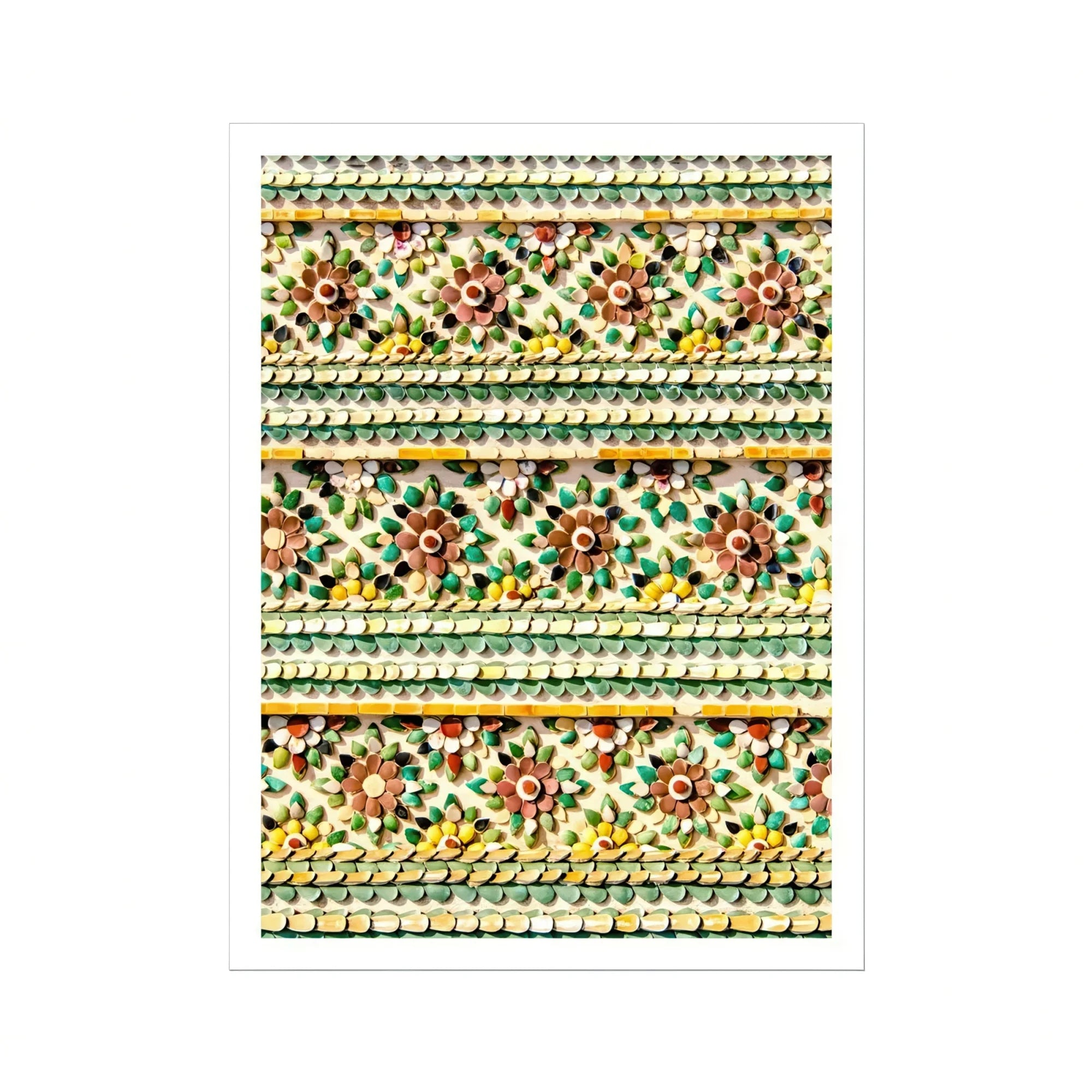 Invite the opulent world of Thai temple aesthetics into your everyday with this exquisite art print. The intricate floral mosaic pattern, from Wat Arun's embellished walls, transforms your space into a sanctuary of Siamese artistry. Delicate petals in sienna and celadon hues intertwine, creating a mesmerizing lattice that echoes the spiritual symbolism of lotus blossoms in Buddhist iconography.