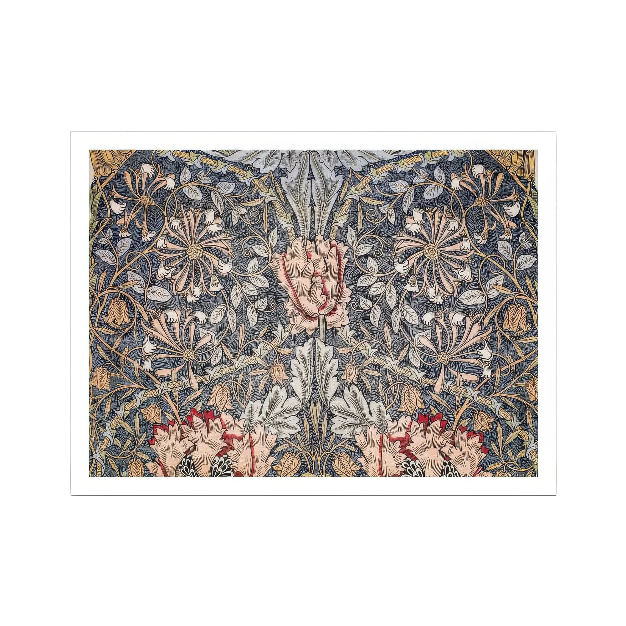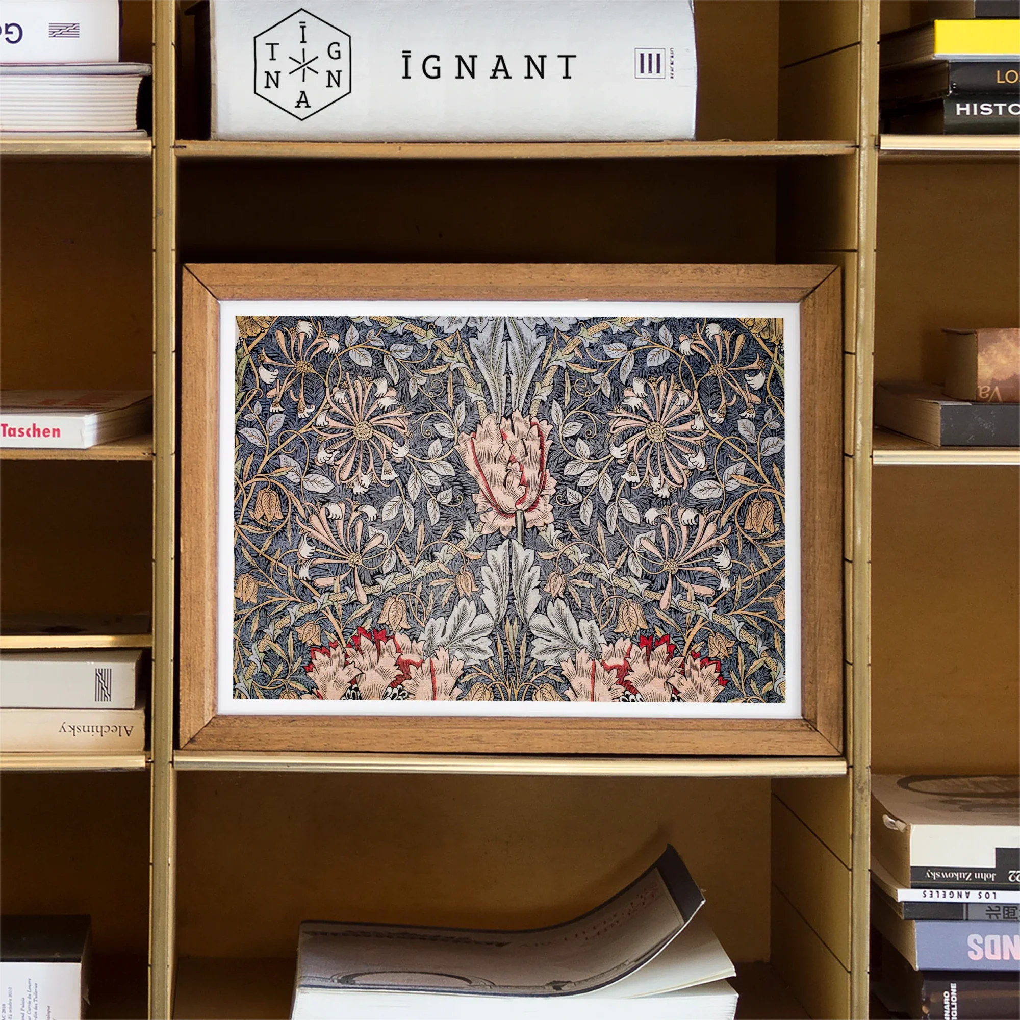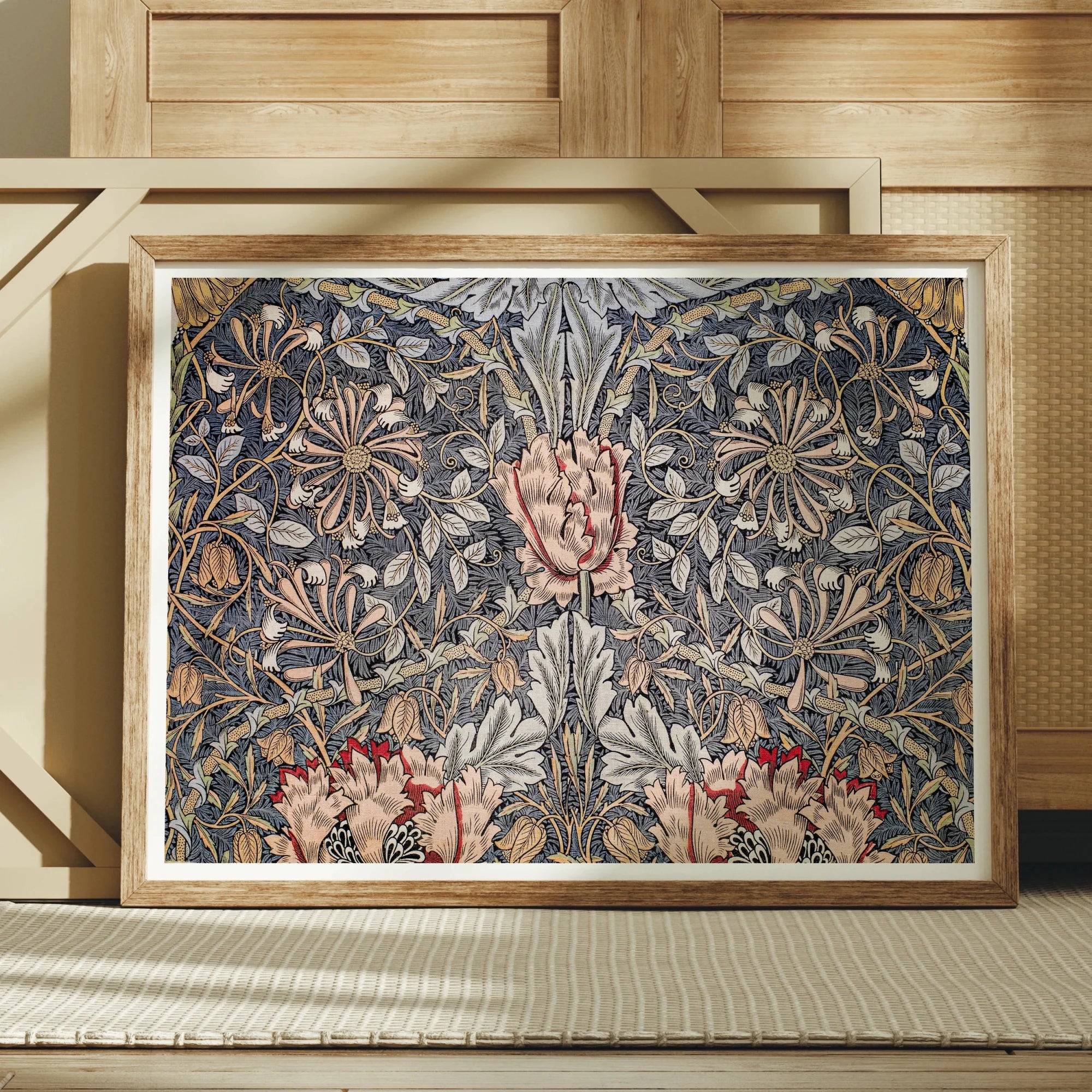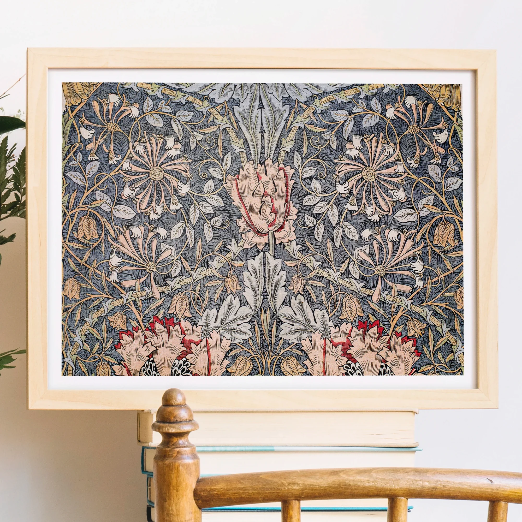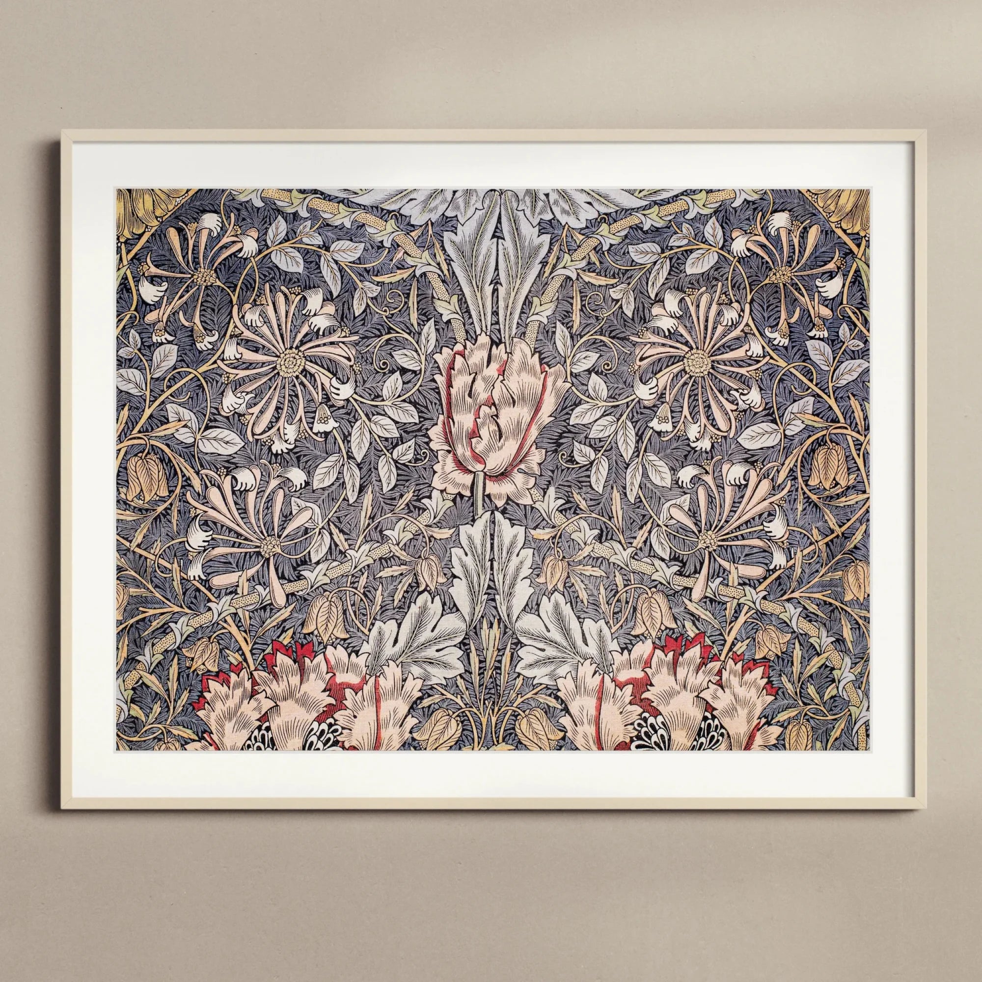 Immerse yourself in William Morris's botanical wonderland with this Honeysuckle art print. You'll be captivated by the intricate dance of flora, where delicate petals and sinuous stems intertwine in a mesmerizing pattern.