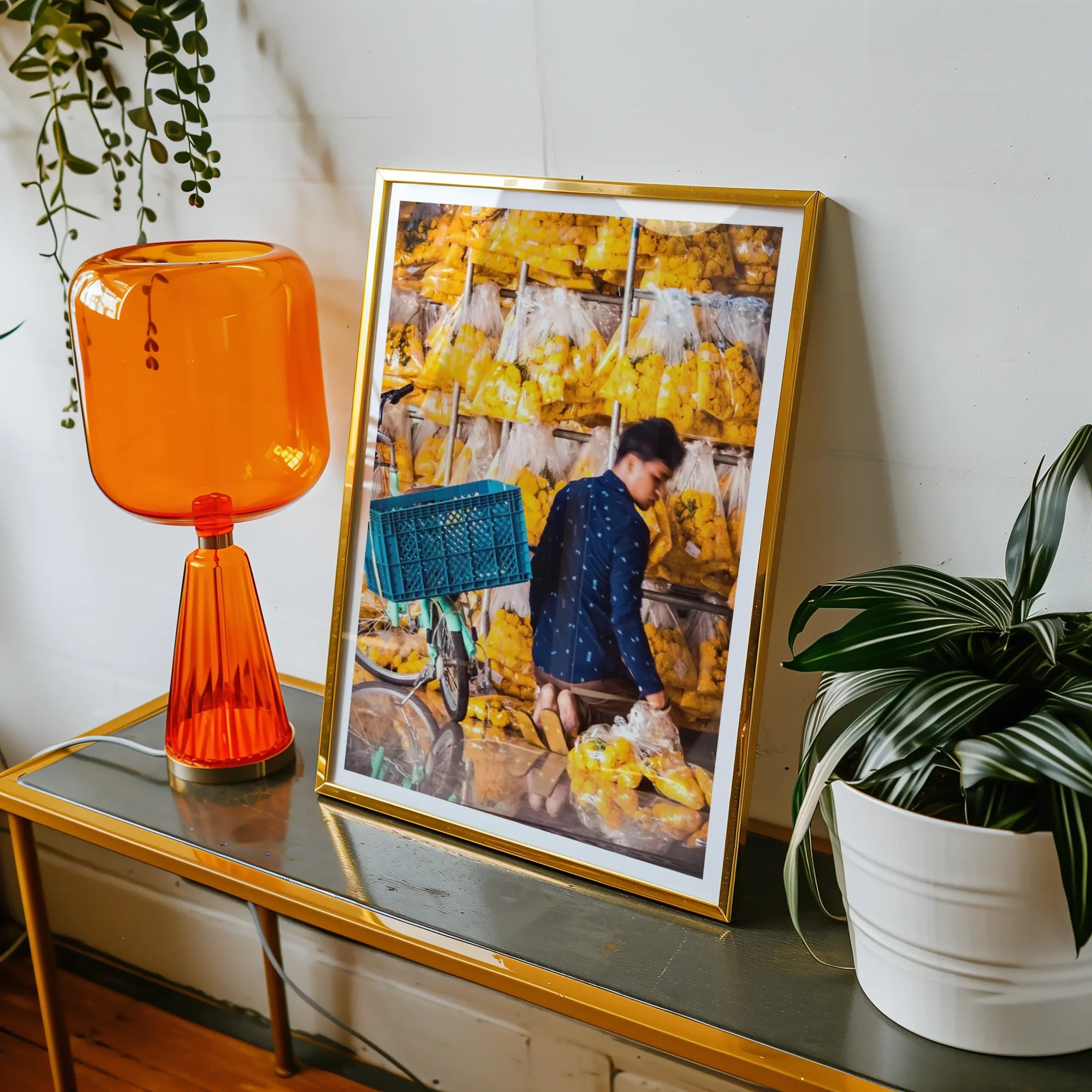 This isn't just photography—it's a time capsule of Thai culture. The vendor's cerulean crate punctuates the amber tide, a modern chariot ferrying ancient traditions. You'll smell the dawn's dewy promise, hear the hushed bartering, feel the market's kinetic rhythm pulsing through your walls.