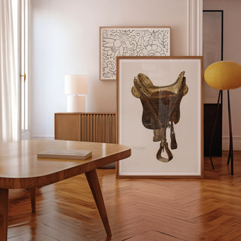 Imagine this print adorning your walls, its earthy hues complementing both rustic farmhouse and modern equestrian decor. The stirrups dangle, ready for phantom riders, while the intricate stitching speaks of meticulous craftsmanship.
