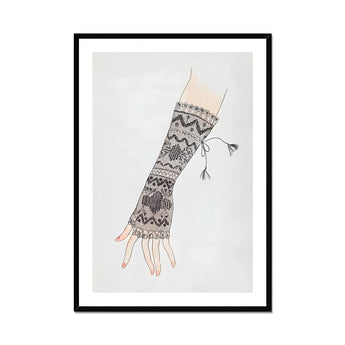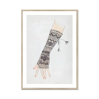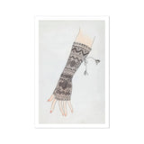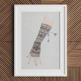 You'll be mesmerized by the fingerless glove's elongated form, adorned with a tapestry of geometric motifs and floral embellishments. The artist's meticulous brushwork brings to life a symphony of textures - from delicate netting to bold zigzags. A whimsical tassel dances at the wrist, adding a touch of playful sophistication.