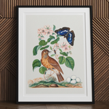 This fine art print reveals the 18th-century Yorkshire naturalist's genius, capturing a Spotted Flycatcher's keen gaze amidst blush-tinted blooms and verdant foliage. A regal Purple Emperor butterfly alights nearby, its iridescent wings a testament to Bolton's meticulous eye.