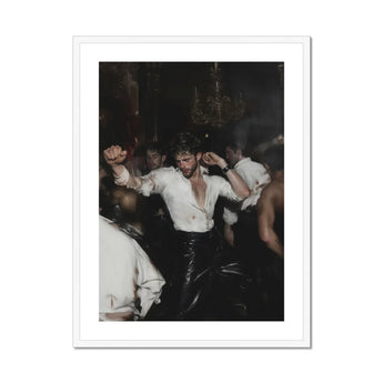 He flings his chest to the ceiling, shirt clinging in soaked whorls, buttons flung like prayers. His face gasping through pleasure’s jaws. Light licks every wet fold of cotton. Muscles locked to rhythm. Pupils wide with motion. Baroque dynamism twisting the air into myth.