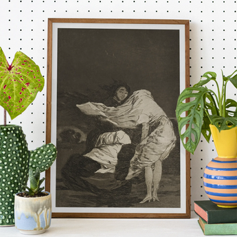 Two figures twist beneath the suffocating dark. Cloth clings to their limbs like fog, faces half-swallowed by shadow. Goya etched not a storm, but the air of dread itself—ink thick as sleep, white scraped from copper like a gasp for light. Pale echowa of virtue in a night that offers none.