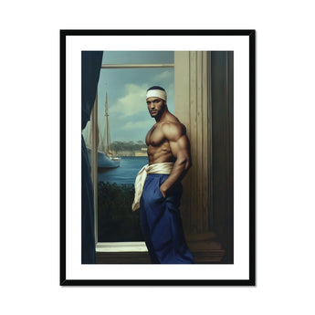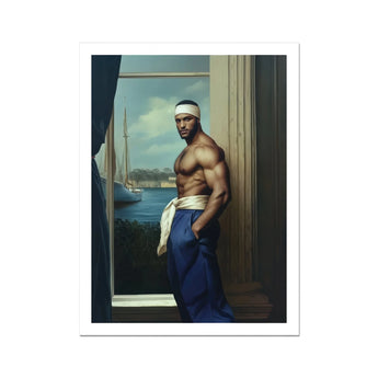 You're drawn into a world of sensual power and gay liberation. The Trade beckons, a Moorish sailor framed by history's window. His muscular form, an ode to masculine beauty, stands proudly against a backdrop of azure waters and billowing sails. This isn't just art—it's a window into homoerotic history made anew in this neoclassical fantasy.