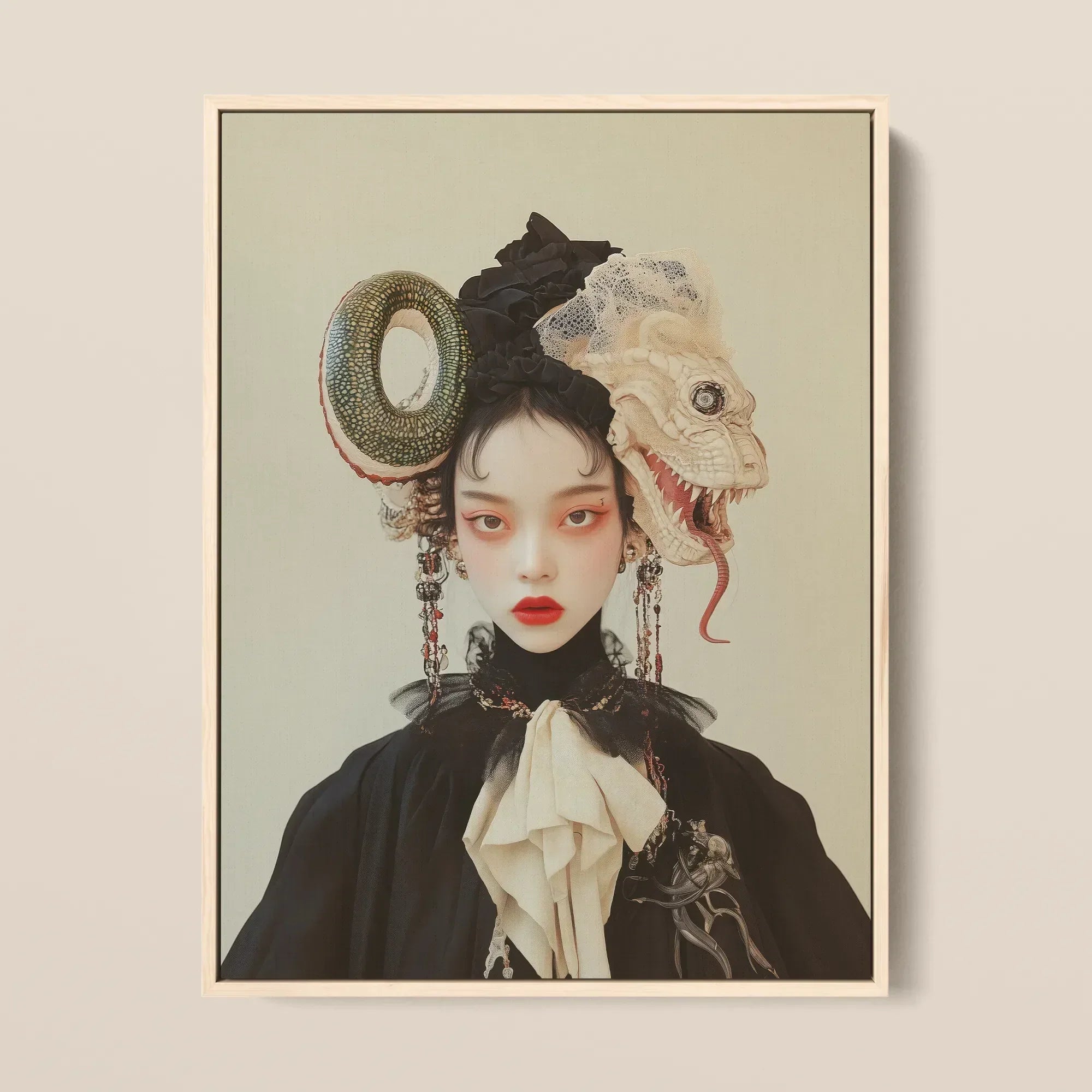 Ryoko stands before you, an ethereal force wrapped in the majesty of ancient myth and queer rebellion. Her gaze pierces through time, inviting you into a world where the boundaries between beauty and terror collapse. The serpentine headdress coils like living dragons around her hair, their scales gleaming with a texture so vivid you feel their presence. Resting atop her head is the skull of a vanquished beast—no mere ornament, but a crown of conquest, marking her as the ruler of a realm beyond the comprehension of mortals.