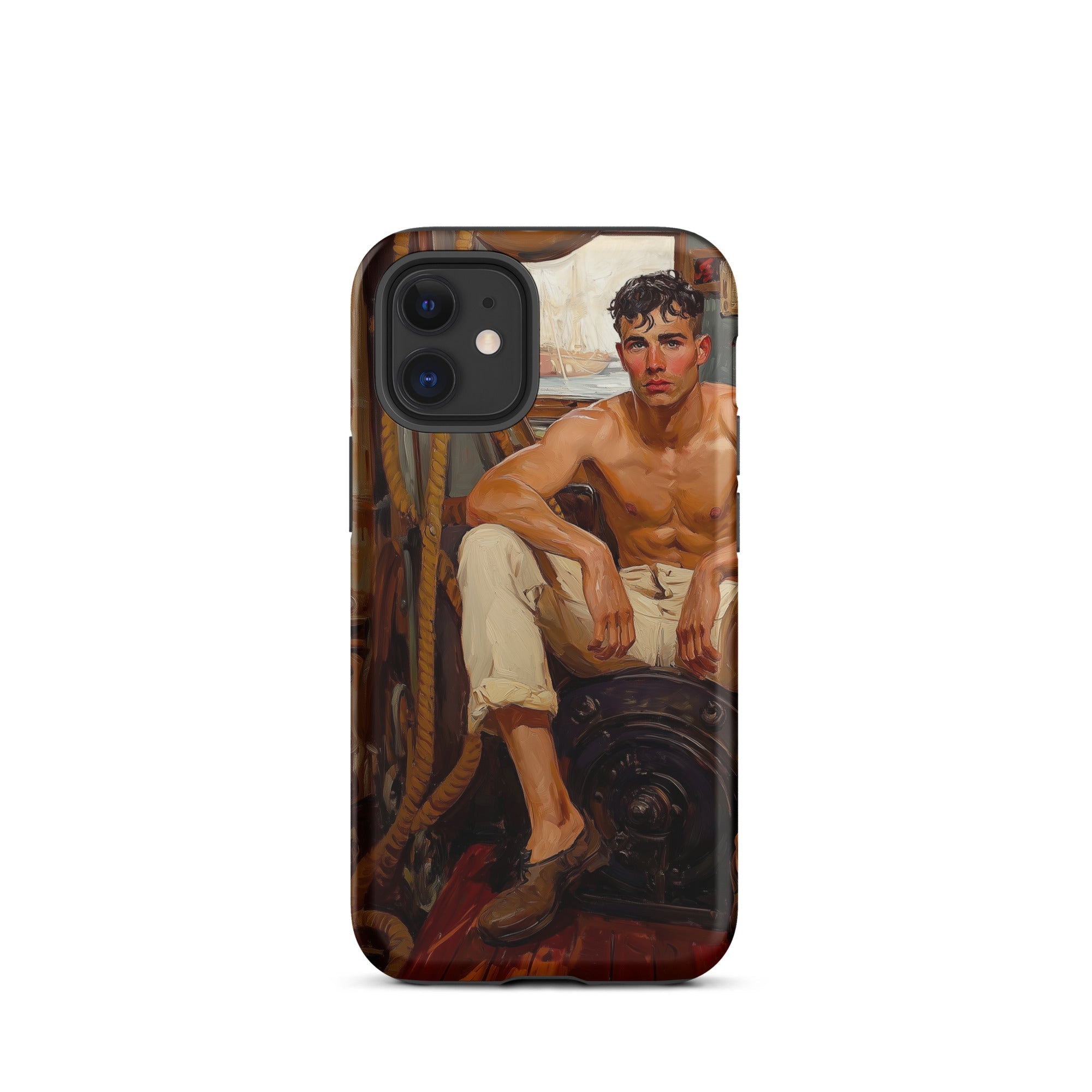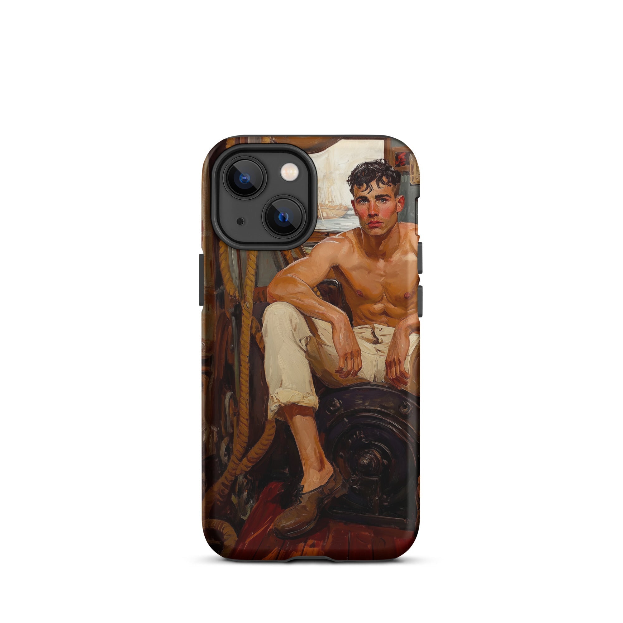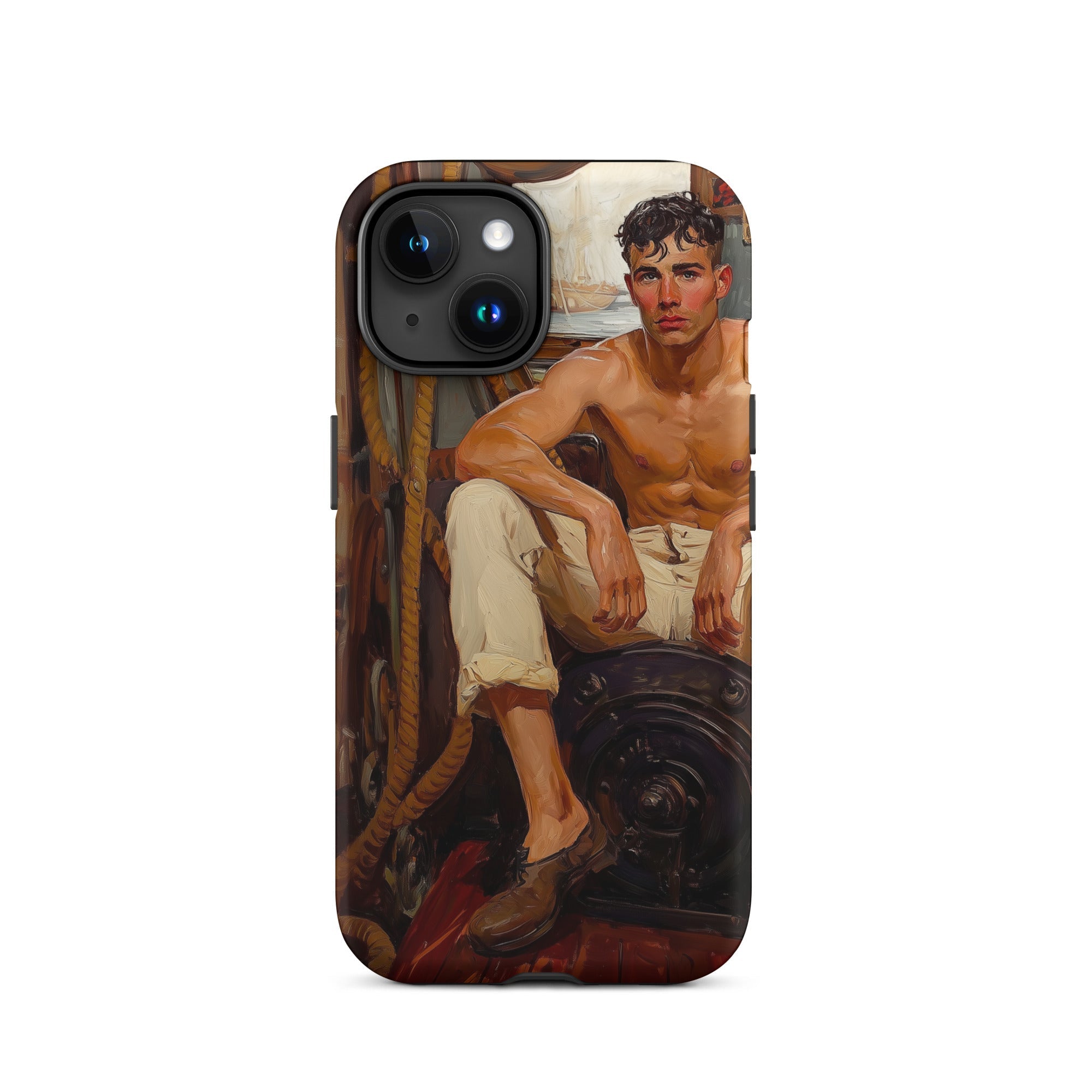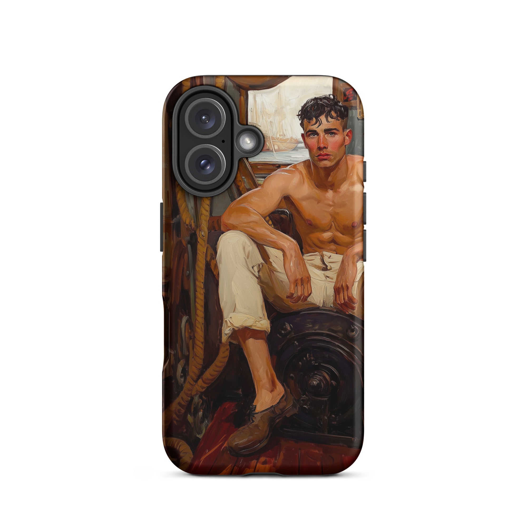 You’ll be holding more than an iPhone case—this gay navy sea queen is a slice of queer maritime history—captured in bold, striking detail. The muscular sailor, legs spread wide and top button undone, stares right at you, daring you to look away. His sun-kissed skin glows against the weathered ship’s interior, ropes coiled at his feet like quiet witnesses to his raw, erotic power.