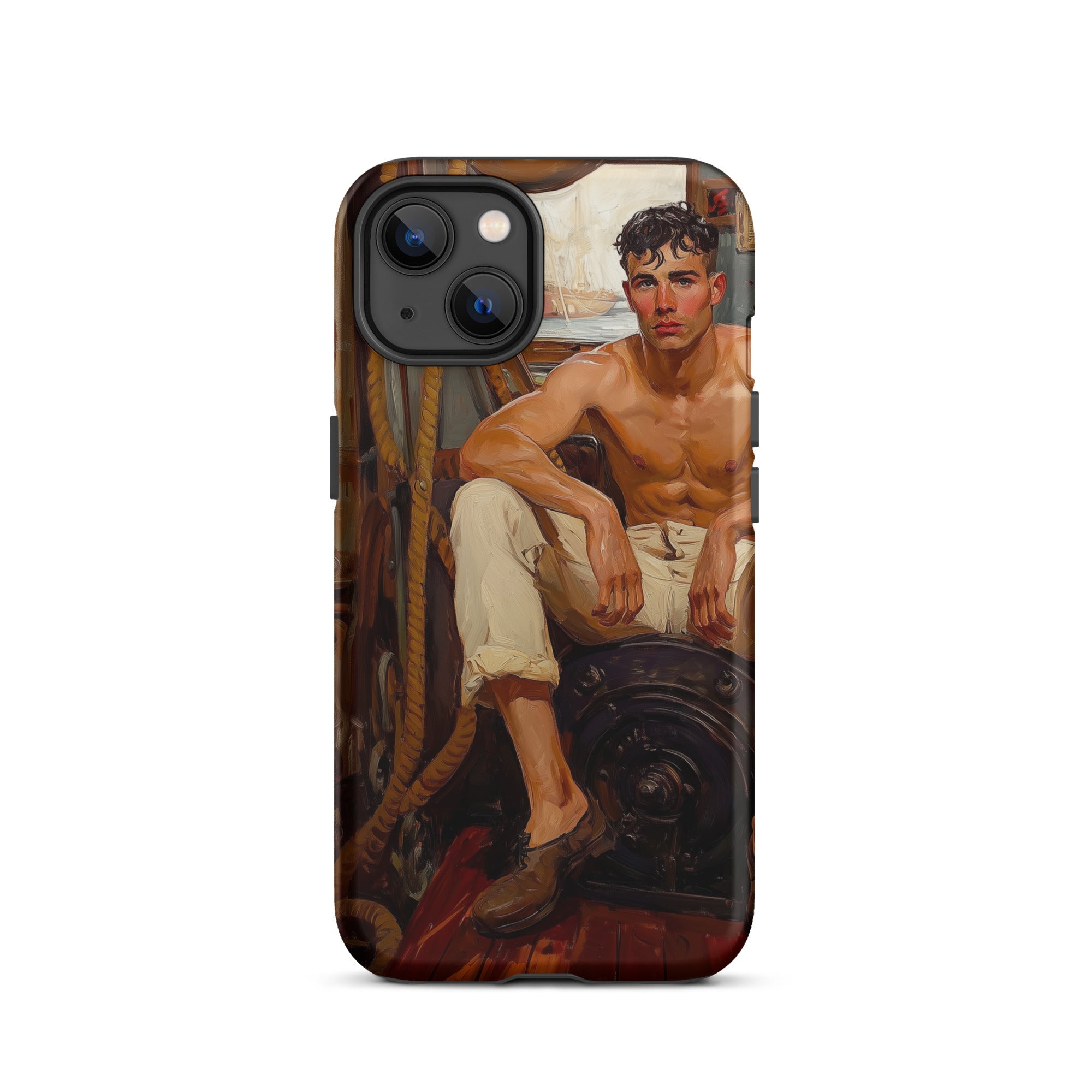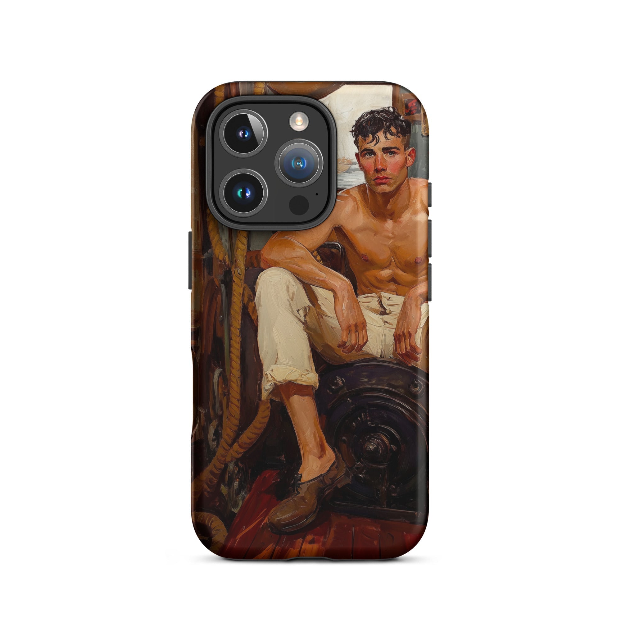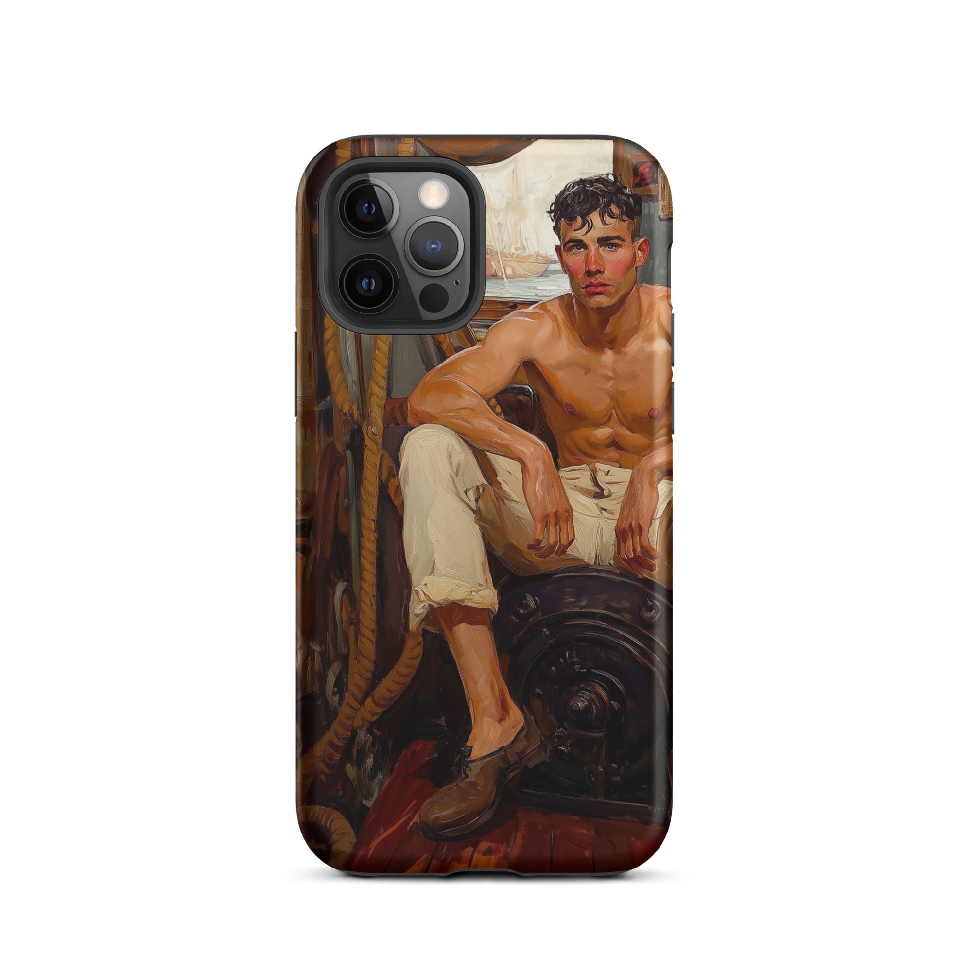 You’ll be holding more than an iPhone case—this gay navy sea queen is a slice of queer maritime history—captured in bold, striking detail. The muscular sailor, legs spread wide and top button undone, stares right at you, daring you to look away. His sun-kissed skin glows against the weathered ship’s interior, ropes coiled at his feet like quiet witnesses to his raw, erotic power.