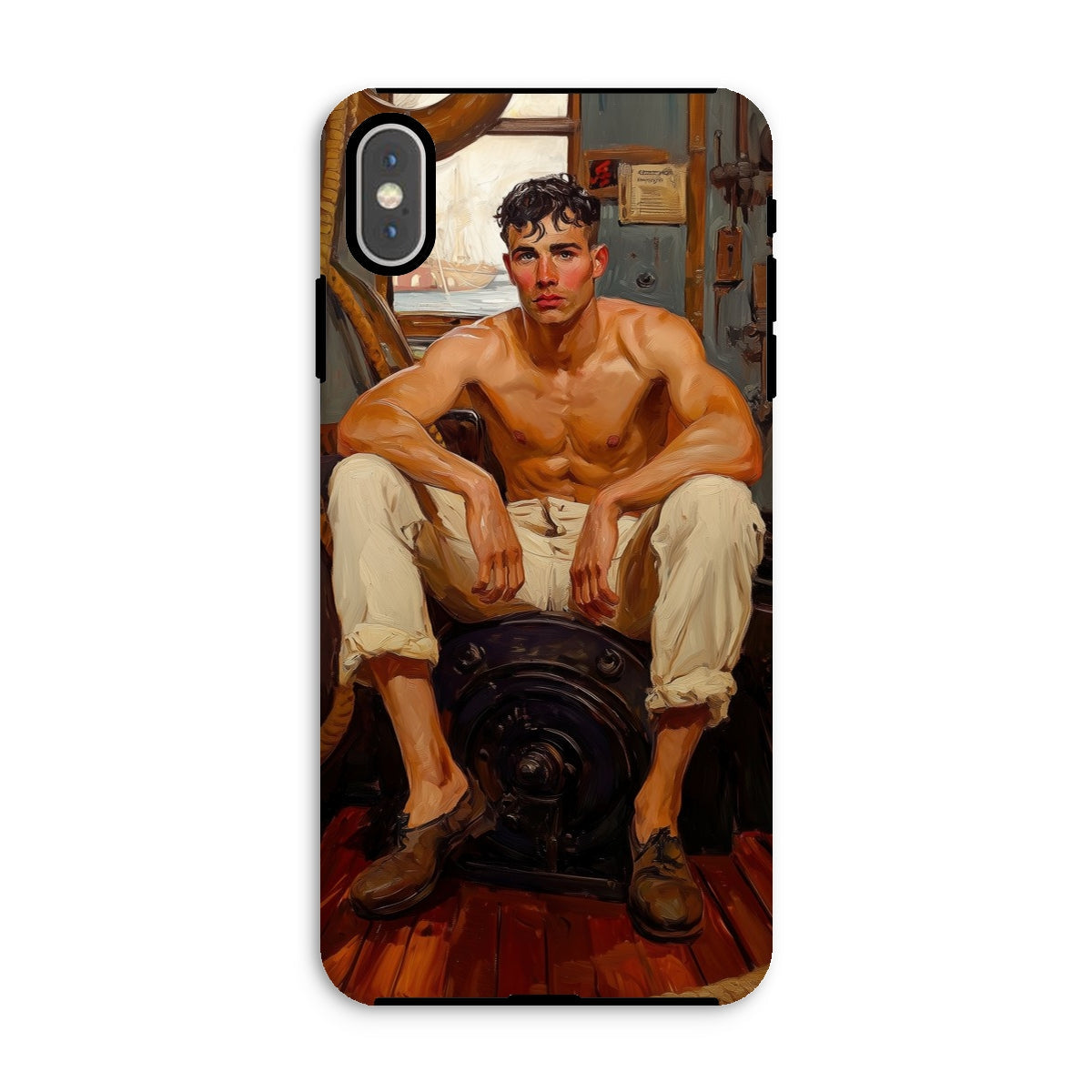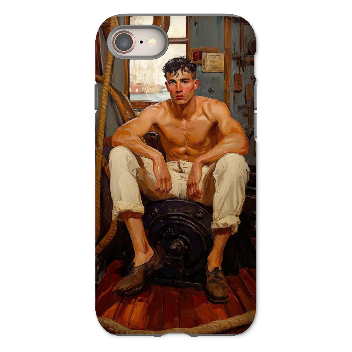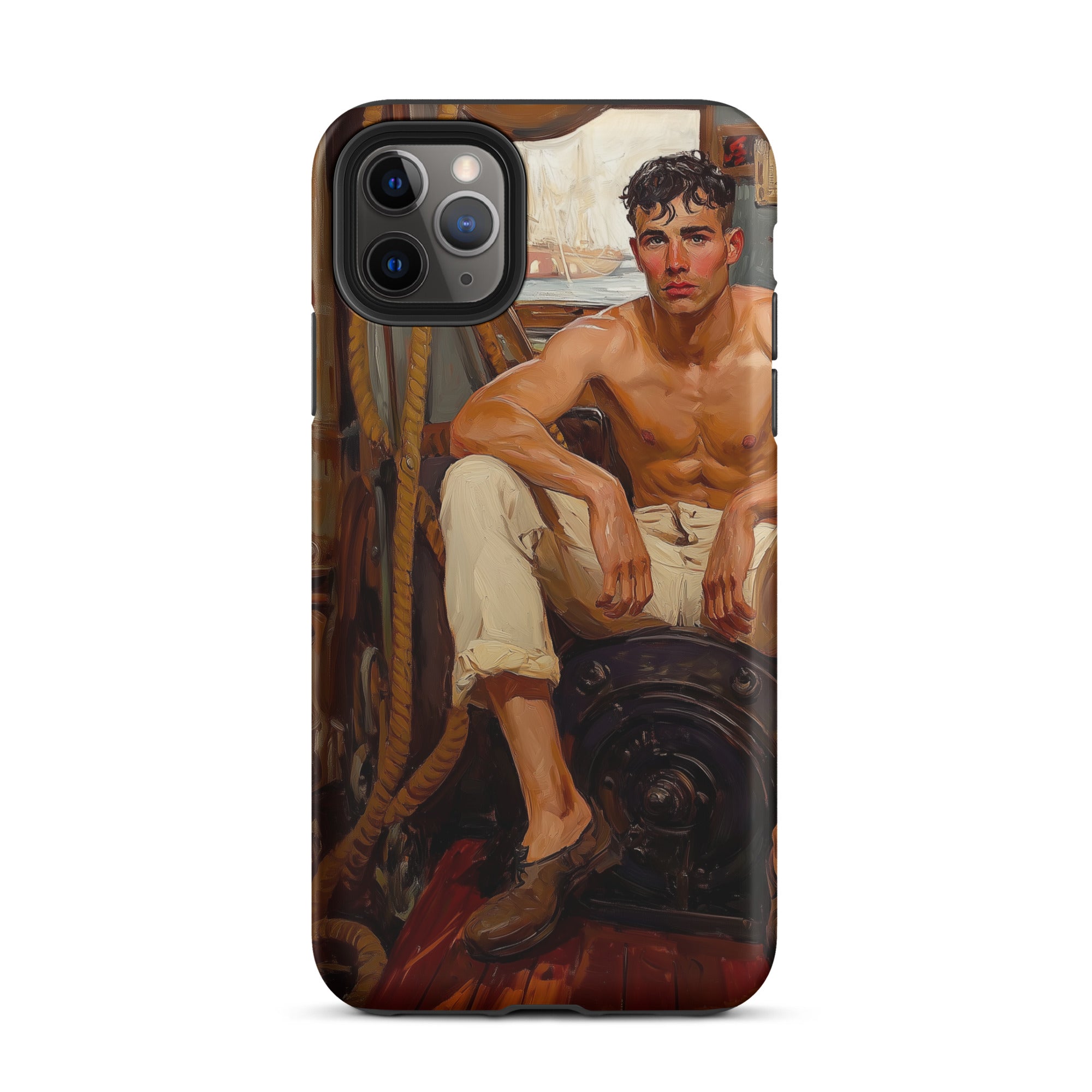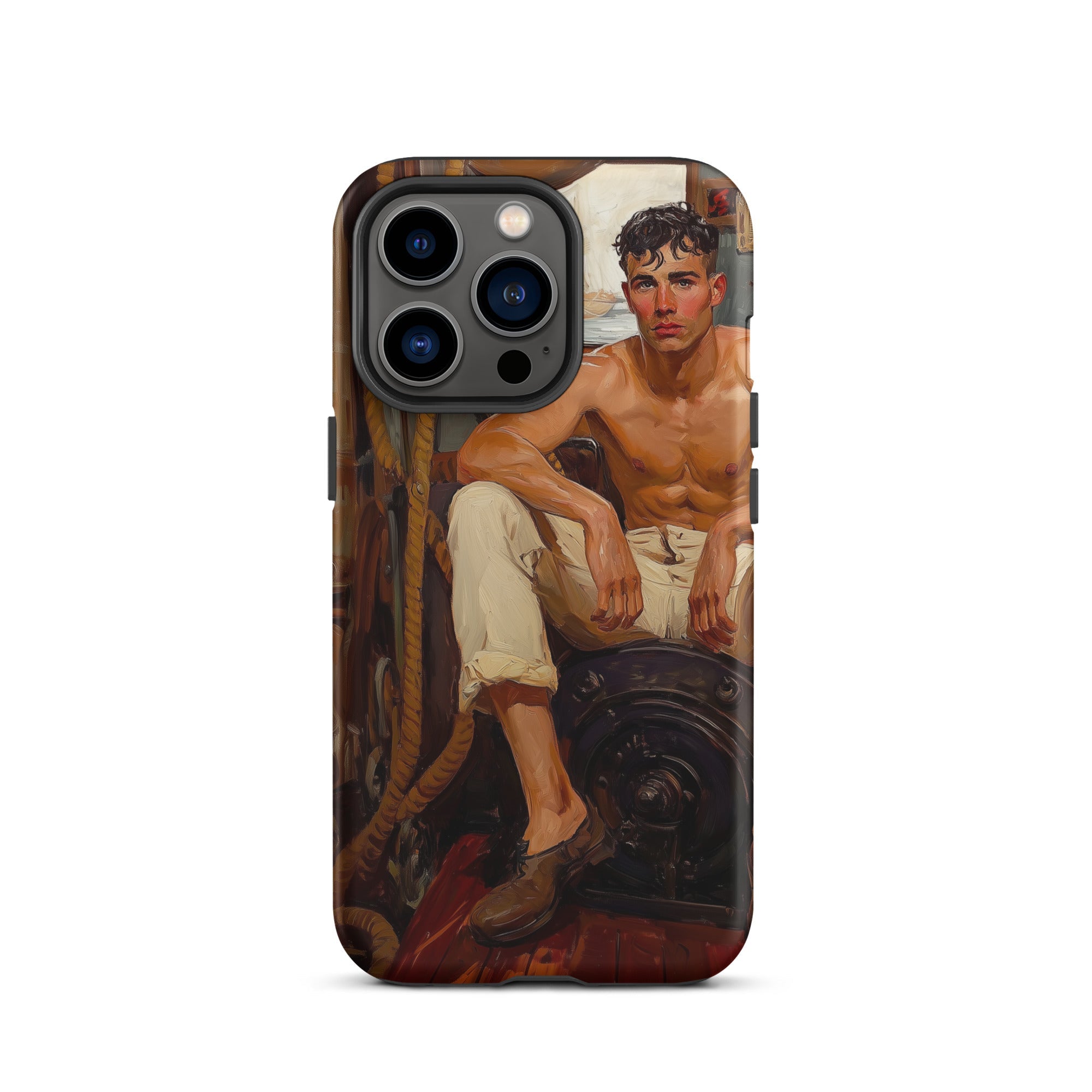 You’ll be holding more than an iPhone case—this gay navy sea queen is a slice of queer maritime history—captured in bold, striking detail. The muscular sailor, legs spread wide and top button undone, stares right at you, daring you to look away. His sun-kissed skin glows against the weathered ship’s interior, ropes coiled at his feet like quiet witnesses to his raw, erotic power.