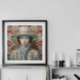 That hat—wide-brimmed, ice blue—casts a shadow both elegant and defiant. A frame for a face as delicate as a celadon teacup and as unyielding as jade. A soft curve of lips, a gaze tempered in exile and longing. They carry the legacy of Peking opera’s dan performers, the swagger of a lonesome cowboy staring down the horizon, the grace of a scholar who understands that poetry is both weapon and refuge.