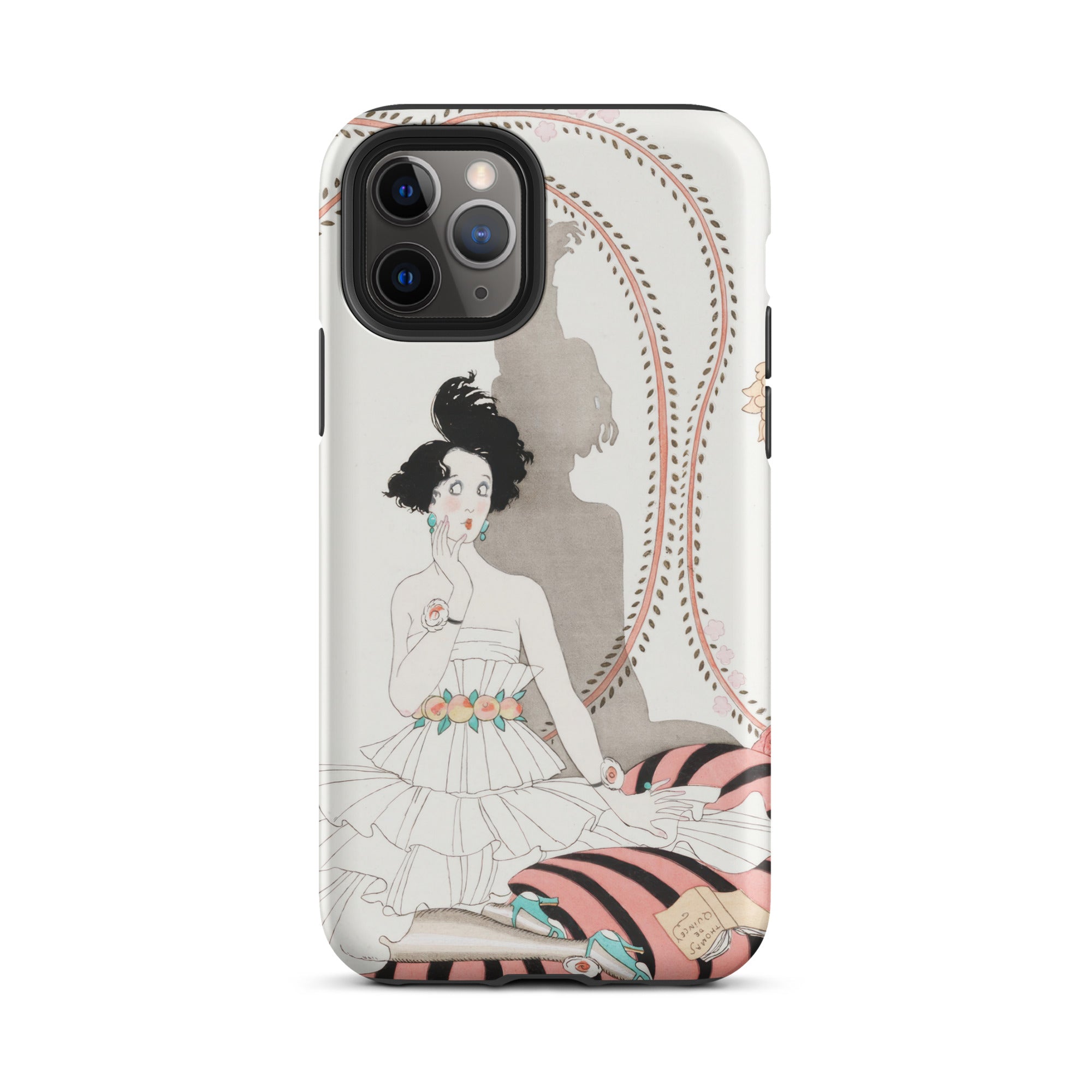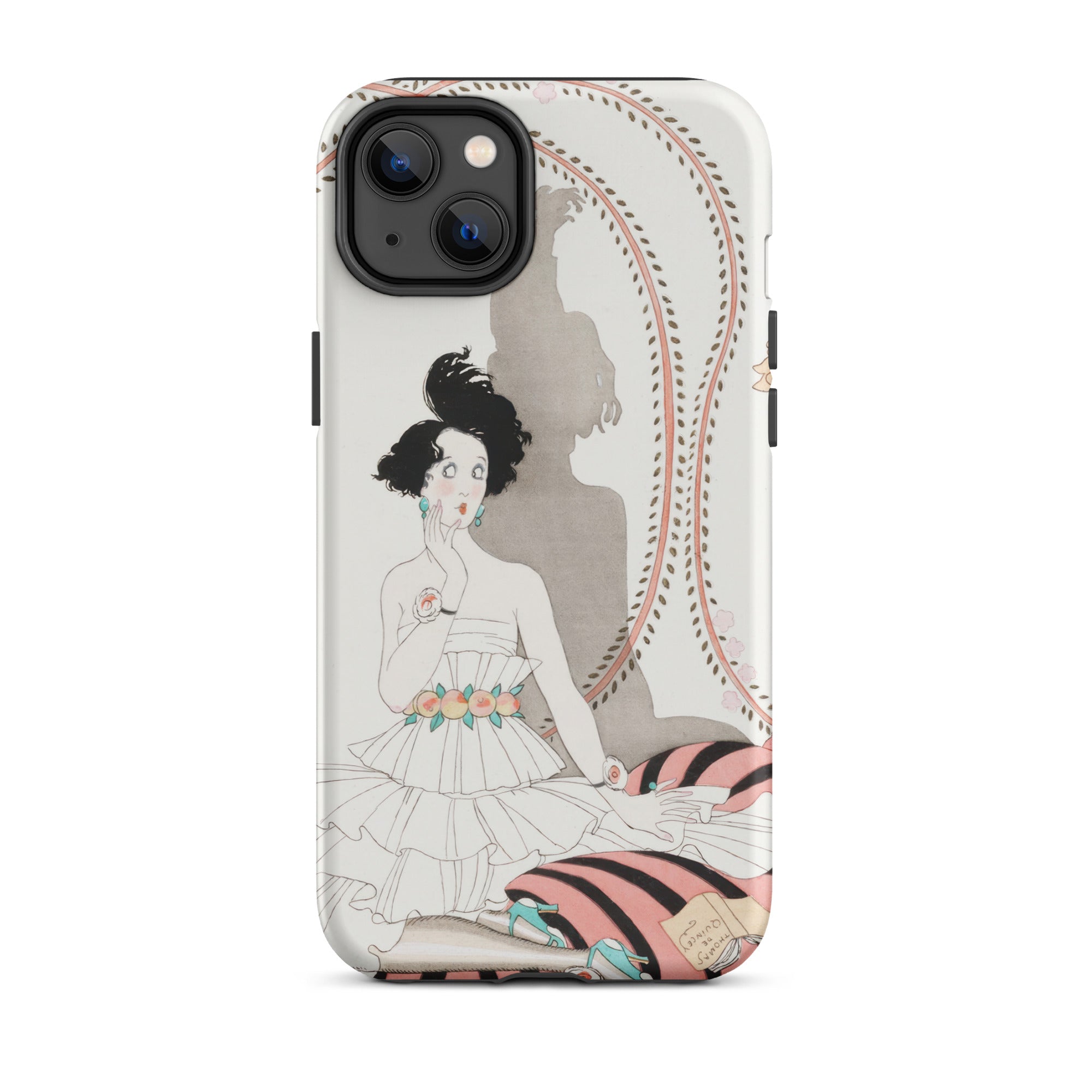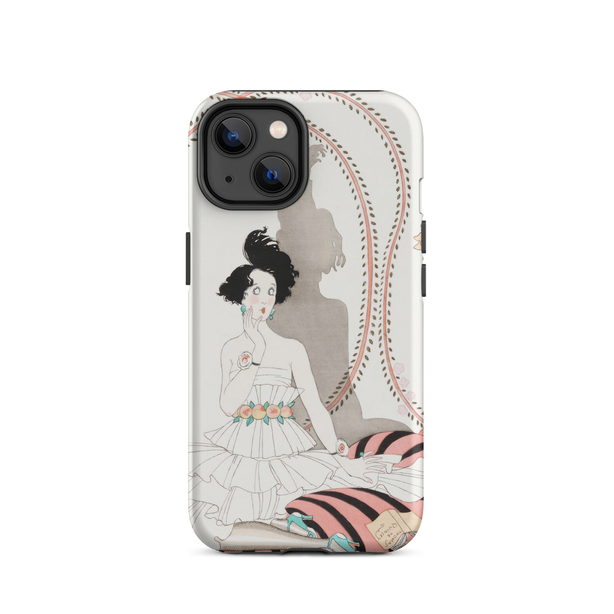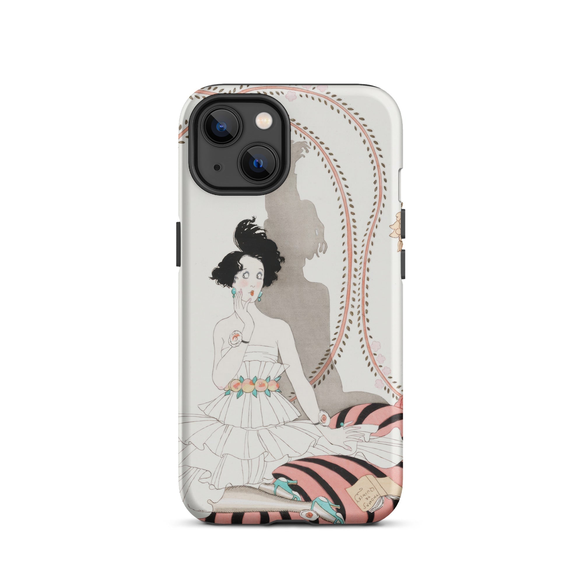 Immerse yourself in the enchanting world of George Barbier's Minuit with this captivating iPhone case. You'll be transported to the height of 1920s Parisian elegance, where Art Deco glamour reigns supreme. Barbier's exquisite pochoir technique brings to life a coquettish figure in a tiered white dress, adorned with delicate roses and turquoise accents.