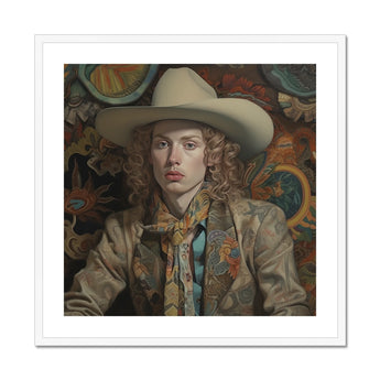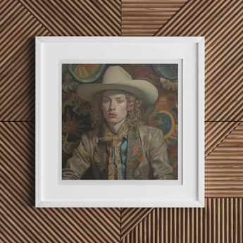 A silk cowboy scarf, knotted at his throat in hues of persimmon and amber, flows like a desert mirage, echoing the Chihuahuan twilight. Behind him, the landscape pulses—an intricate paisley Western backdrop, infused with the surreal bloom of psychedelic desert art. Floral cowboy aesthetics merge with cosmic rodeo dreams, whispering of love, resilience, and reclamation. The West was always queer. Ollie is simply here to remind us.