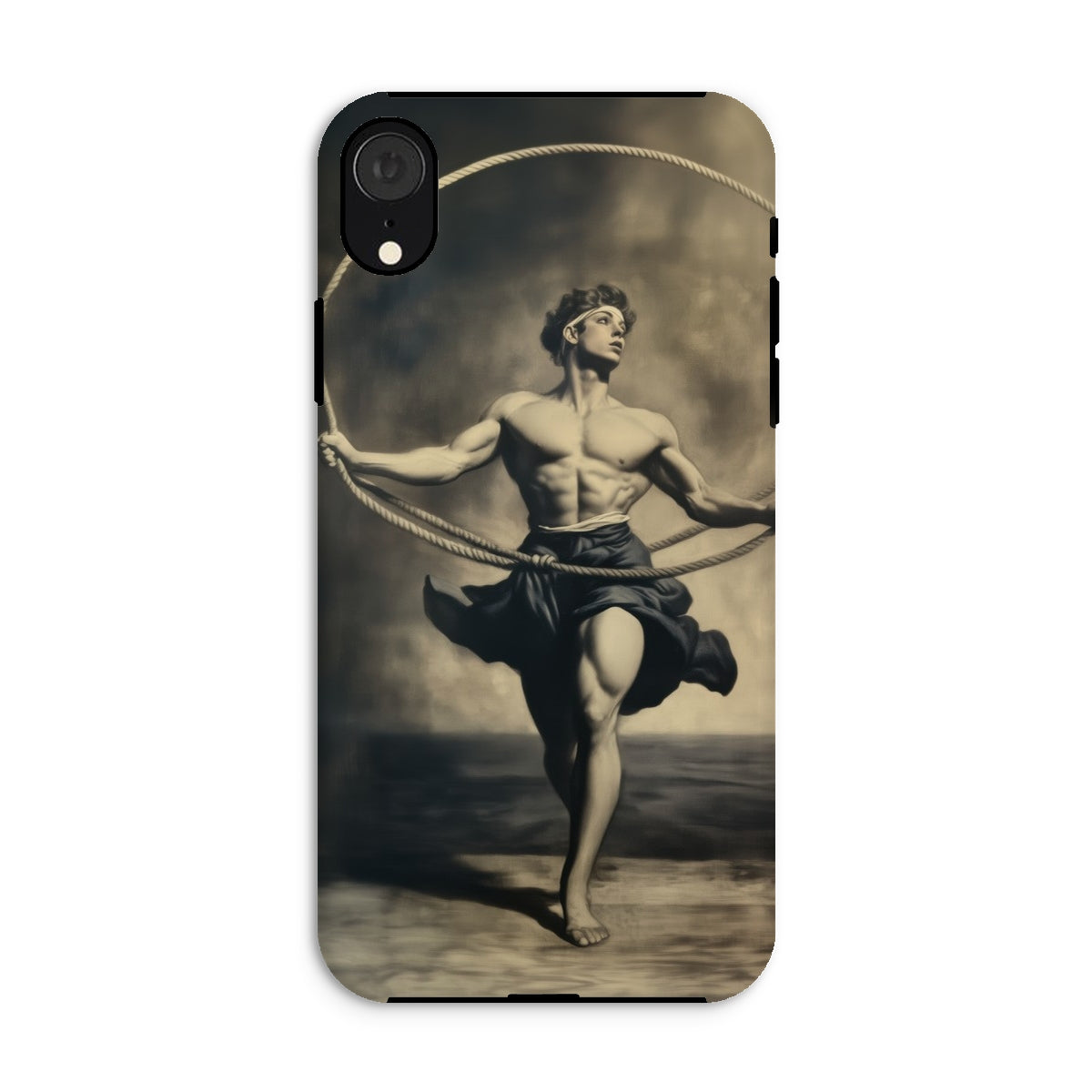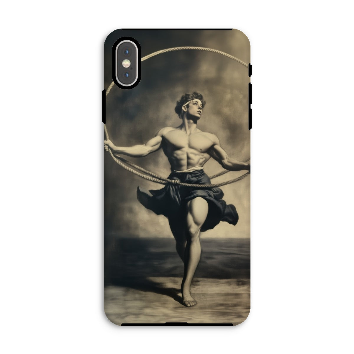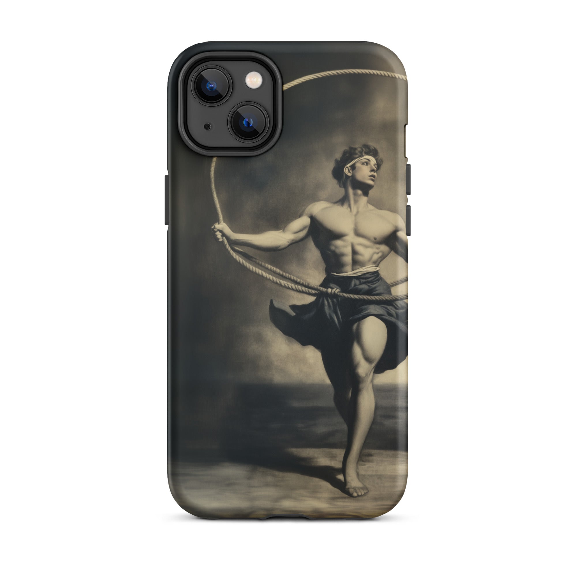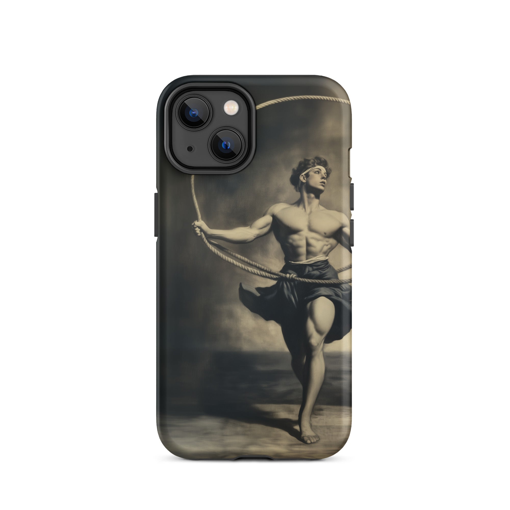 Behold, a sepia-toned symphony of queer liberation. This iPhone case flaunts a muscular Adonis, a ringleader of desire caught mid-dance. His chiseled form defies gravity, suspended in a rope's embrace.