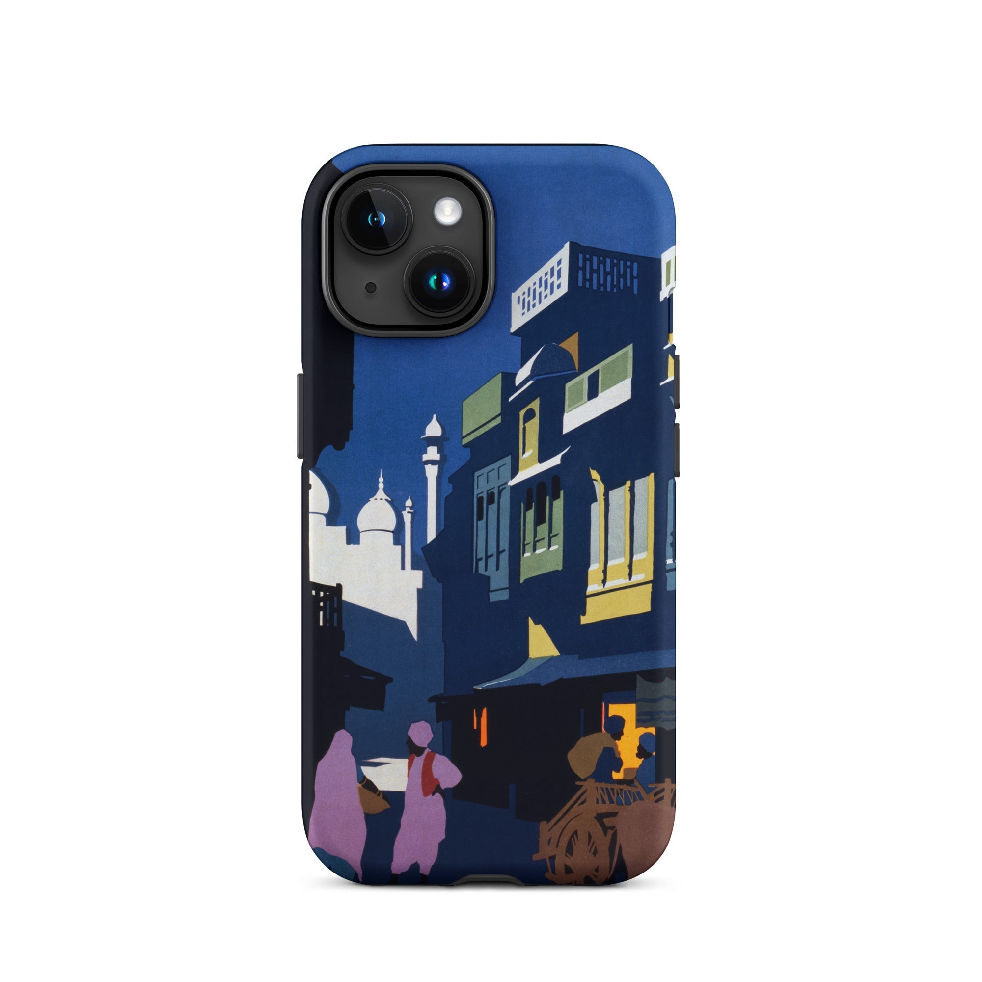 The street unfurls into an intimate horizon, its depths illuminated by the faint silhouettes of mosque domes and spires. These architectural beacons speak of Mughal grandeur, their elegance a whispered dialogue with the sky. This tableau, frozen in flat, layered lithographic hues, captures more than a nocturnal scene; it encapsulates the convergence of tradition and modernity, mystery and familiarity, casting India as both a lived experience and an eternal dreamscape.