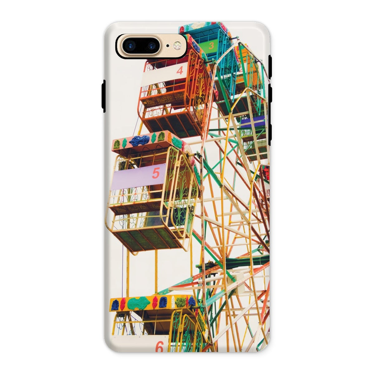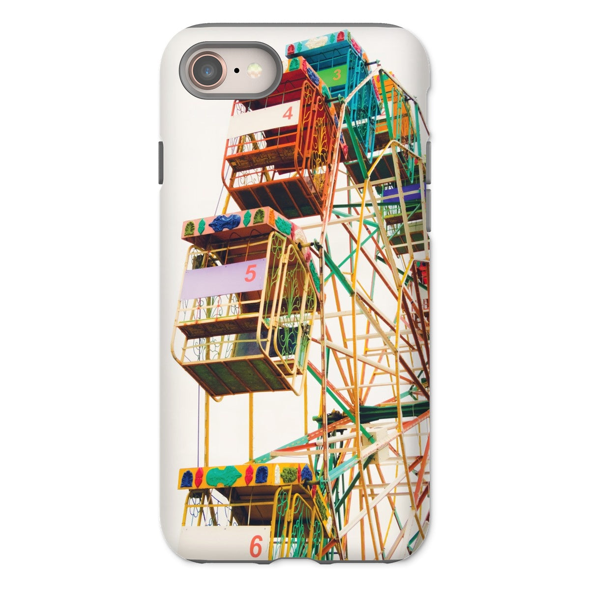 Behold, a kaleidoscopic iPhone case that'll make your device the belle of the midway! This vibrant snapshot showcases a dazzling Ferris wheel, its skeletal frame a riot of teal, orange, and yellow. You'll spot gondolas adorned with whimsical patterns and bold numbers, beckoning thrill-seekers to hop aboard.