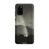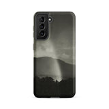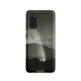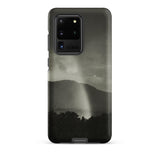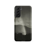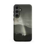 Das Foto atmet in tonalen Abstufungen. Zinnfarbene Himmel drücken gegen die dunkle Baumgrenze, weicher Dampf löst sich am Grat auf. Dieses Samsung-Case trägt diese eingefangene Stille, seine Oberfläche spiegelt Gelatinesilber-Texturen wider, tiefen Kontrast und leuchtende Intervalle, wo die Sonne den Regen berührt.
