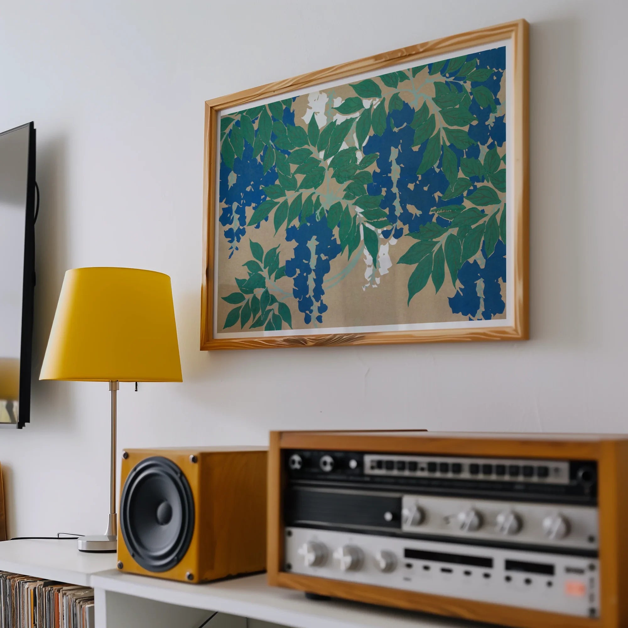 Sekkas Druck "Wisteria from Momoyogusa" wird Ihren Raum mit seinem hypnotischen Tanz von Indigo Blooms und Emerald Laub verzaubern. In eine faszinierende Welt von transportiert werden Meiji-era Kunst. Setzen Sie Sgainst eine sandige Hintergrund Jugendstil's fließende Gnade.