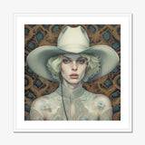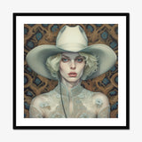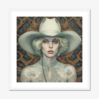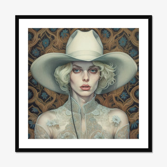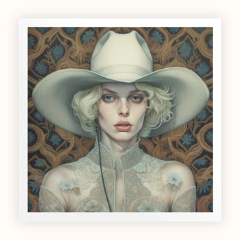 Der Mond neigt sich tief, ein blasser Zeuge ihres Mutes. Ein Geisterreiter in Perlen und Spitze, zieht sie durch die Stille der Wüste, wo die Echos ungezähmter Liebe sich in die Wände der Canyons eingraben. Unter dem breiten Rand eines elfenbeinfarbenen Cowboy-Huts ist ihr Blick unerbittlich—ein Blau, so scharf, dass es durch den Mythos selbst schneiden könnte. Sie sucht keine Erlaubnis, noch bittet sie um die Gunst der Geschichte. Sie schreibt ihre eigene Folklore in das Mark des Westens, wo sapphische Cowgirls einst Seite an Seite unter einer gleichgültigen Sonne ritten.