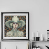 Ihre durchsichtige viktorianische Bluse ist mit etwas älterem als die Zeit bestickt—florale Stickereien, die wie Wüstenprimeln nach einem seltenen Regen blühen, ihre hauchdünnen Fäden flüstern von den Vermächtnissen weiblicher Outlaws und den geheimen Sprachen mondbeschienener Saloons. Platinblonde Locken winden sich wie Pistolenrauch, weich aber beharrlich, umrahmen ein Gesicht so unergründlich wie die offene Prärie. Sie ist eine westliche gotische Vision, wo barocke Weiblichkeit auf den unbrechbaren Geist der Grenze trifft—weich, ungezähmt, unmöglich zu vergessen.