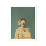 Schwuler Heiliger? Oder könnte dies ein Engel im Exil sein, ein blinder Prophet, der über den Schleier hinaus sieht? Die Augenbinde evoziert Gerechtigkeit, Schicksal, queere Mystik—sie hallt mittelalterliche Darstellungen göttlicher Ekstase und zeitgenössischer queerer Auslöschung wider. Ihre Stille vibriert vor Spannung: Sind sie im Begriff zu transzendieren oder sich hinzugeben? Caravaggios Chiaroscuro flackert im sanften Leuchten auf ihrer Haut, ein Echo klassischer Skulptur, das mit der rohen Intimität queerer Porträtkunst kollidiert.