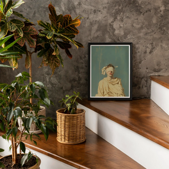 In Elfenbein gehüllt, schwebt ein schwuler Heiliger zwischen dem Heiligen und dem Sinnlichen—ein neoklassischer Märtyrer, wiedergeboren in Öl und Licht. Schatten küssen die Konturen ihres Gesichts, eine griechisch-römische Erscheinung mit Lippen, die zwischen Stille und Beichte schweben. Der cremefarbene Stoff fällt wie die Gewänder der Renaissance-Engel, aber der Hintergrund strahlt Modernität aus—abstraktes Türkis, gestreift wie Erinnerung, die sich in Pigment auflöst.