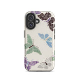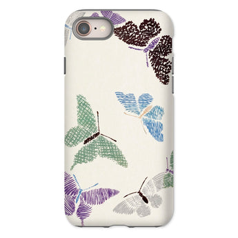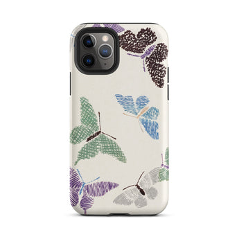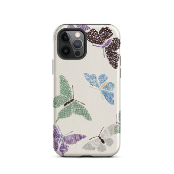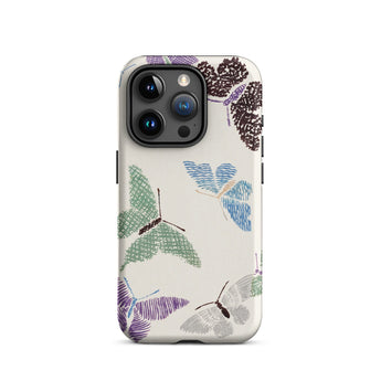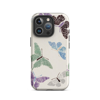 Eine zarte Choreografie entfaltet sich in Kamisaka Sekkas Schmetterlingen, die mit meisterhafter Präzision auf diesem iPhone-Case dargestellt sind. Sieben Schmetterlinge, jeder mit komplizierten Texturen geschmückt—gewebte Karos, rhythmische Streifen und weiche Punkte—flattern über eine cremige Fläche. Ihre gedämpften Töne von Lavendel, Jade, Azurblau und Kastanie sind mit subtilen Grautönen ausbalanciert und erzeugen ein harmonisches, aber dynamisches Zusammenspiel.