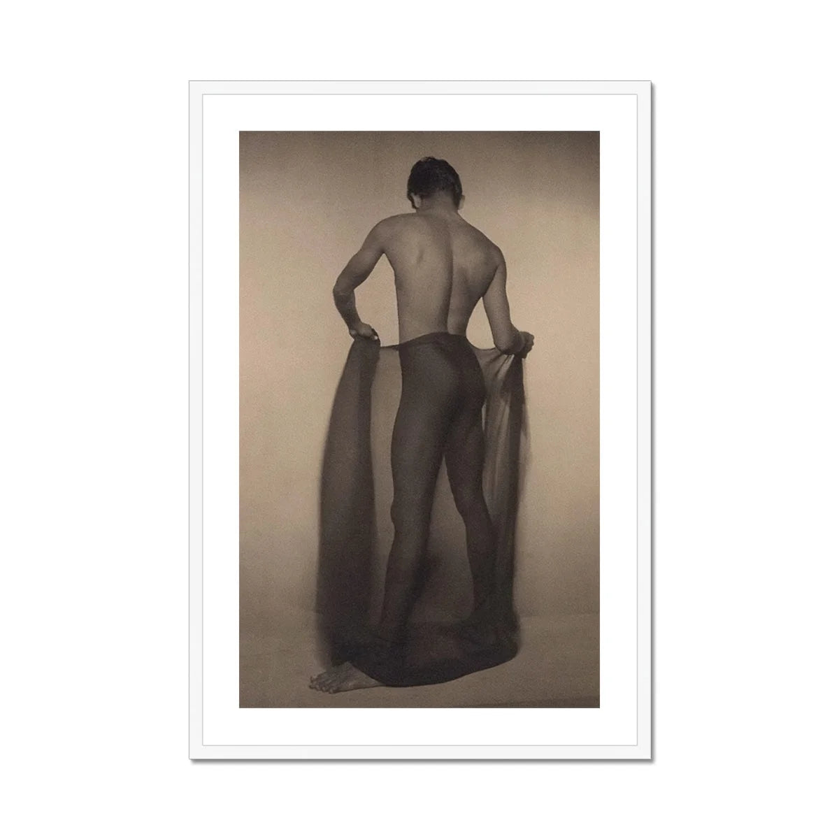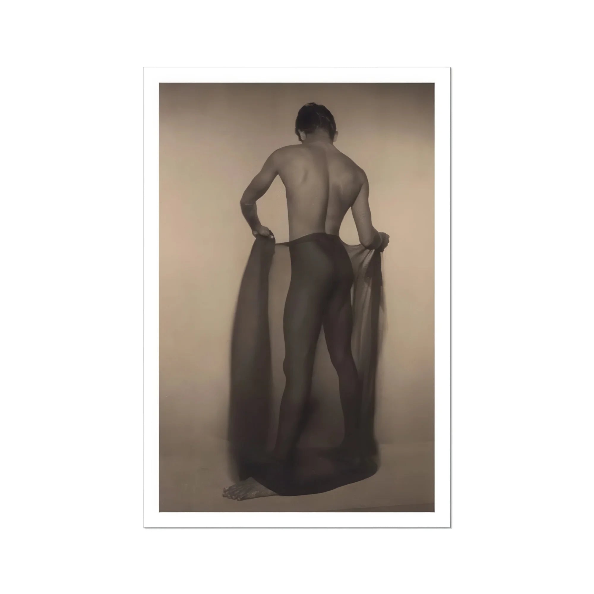 In Männlicher Akt in Vetti von Lionel Wendt drapiert, finden wir eine erotische Erkundung der männlichen Form und kulturellen Drapierung. Das Subjekt steht mit dem Rücken zugewandt, ein durchscheinender Stoff umhüllt zart seinen Unterkörper und erzeugt ein Spiel von Licht und Schatten, das die muskulösen Konturen und die sehnige Eleganz seiner Physis betont.