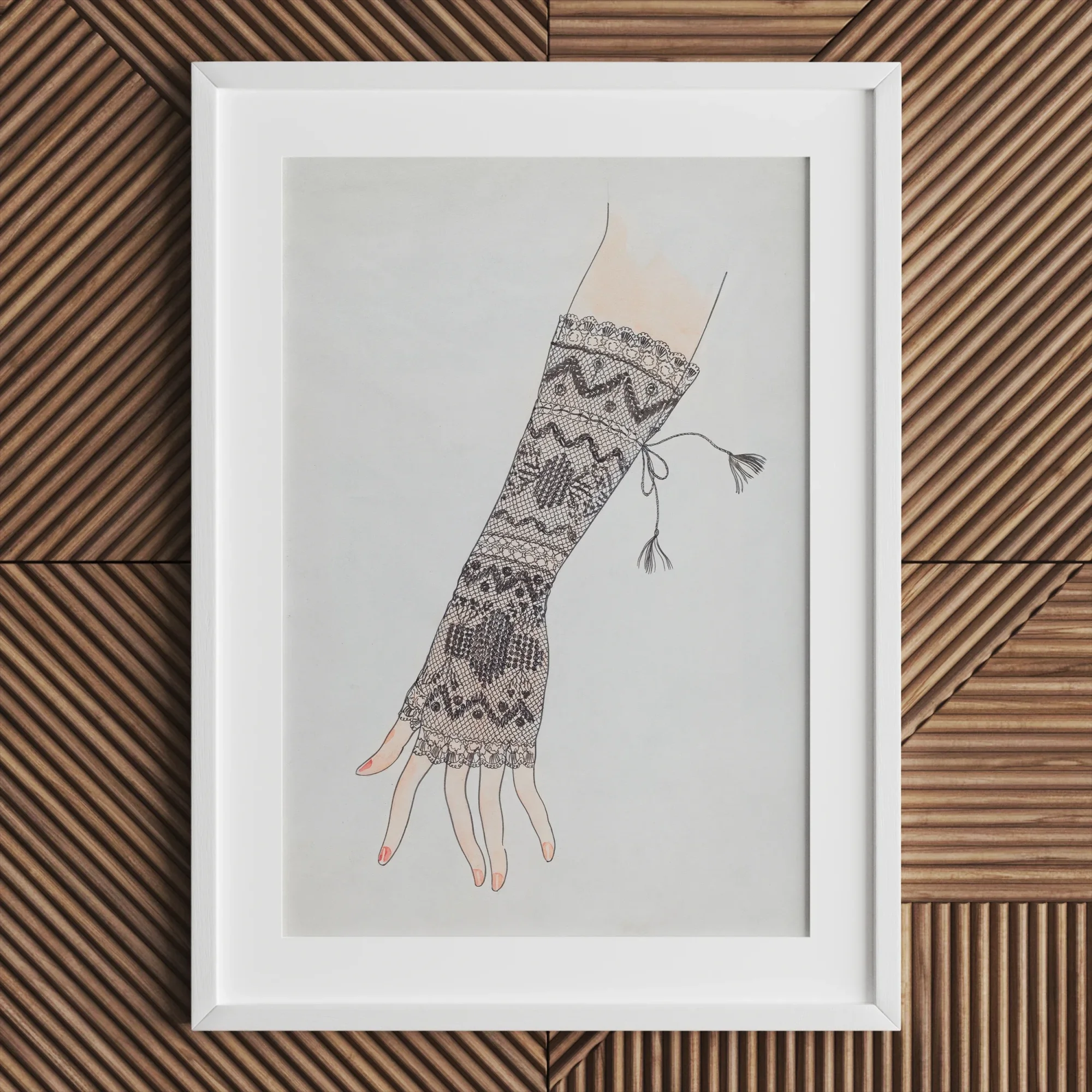 Sie werden von der verlängerten Form des fingerlosen Handschuhs fasziniert sein, der mit einem Wandteppich aus geometrischen Motiven und floralen Verzierungen geschmückt ist. Die akribische Pinselarbeit der Künstlerin erweckt eine Symphonie von Texturen zum Leben - von zartem Netz bis zu kräftigen Zickzacklinien. Eine verspielte Quaste tanzt am Handgelenk und verleiht einen Hauch von spielerischer Raffinesse.