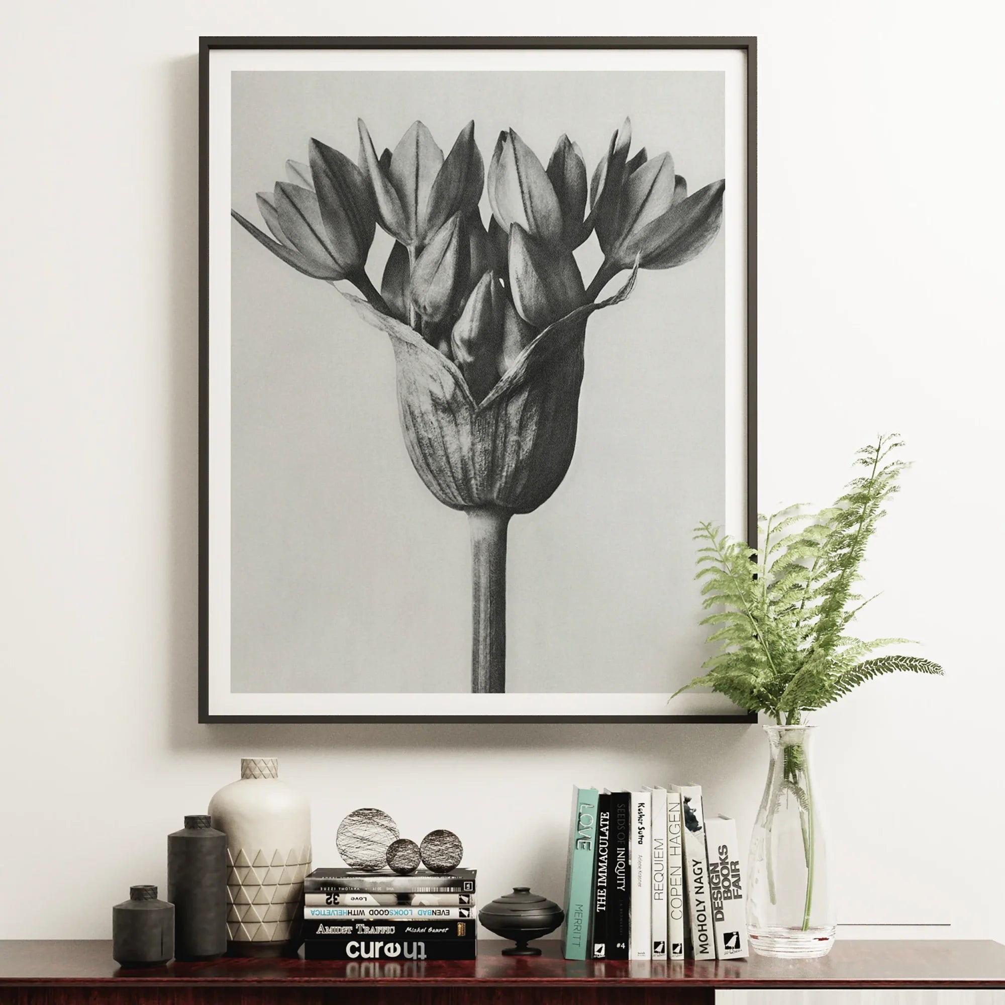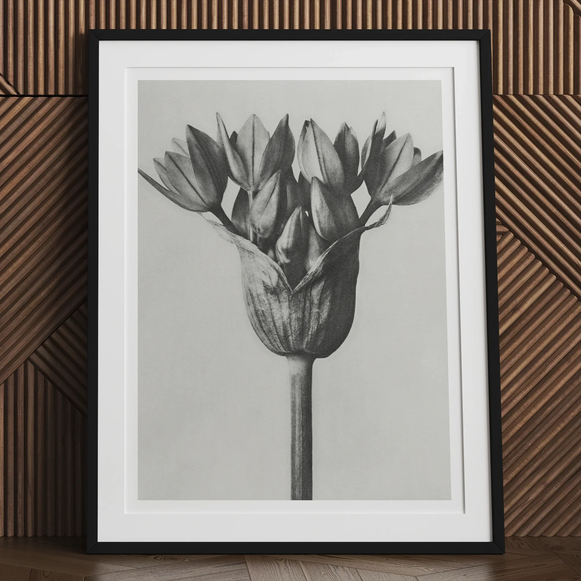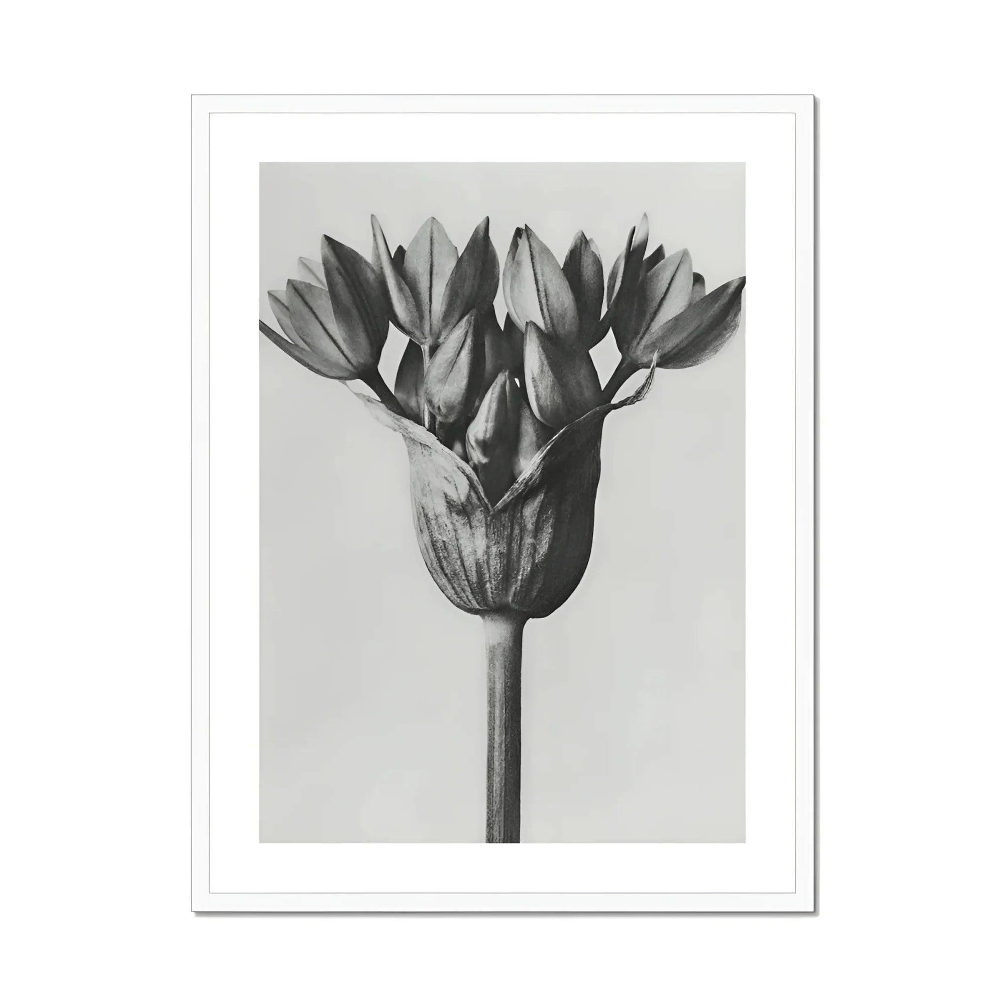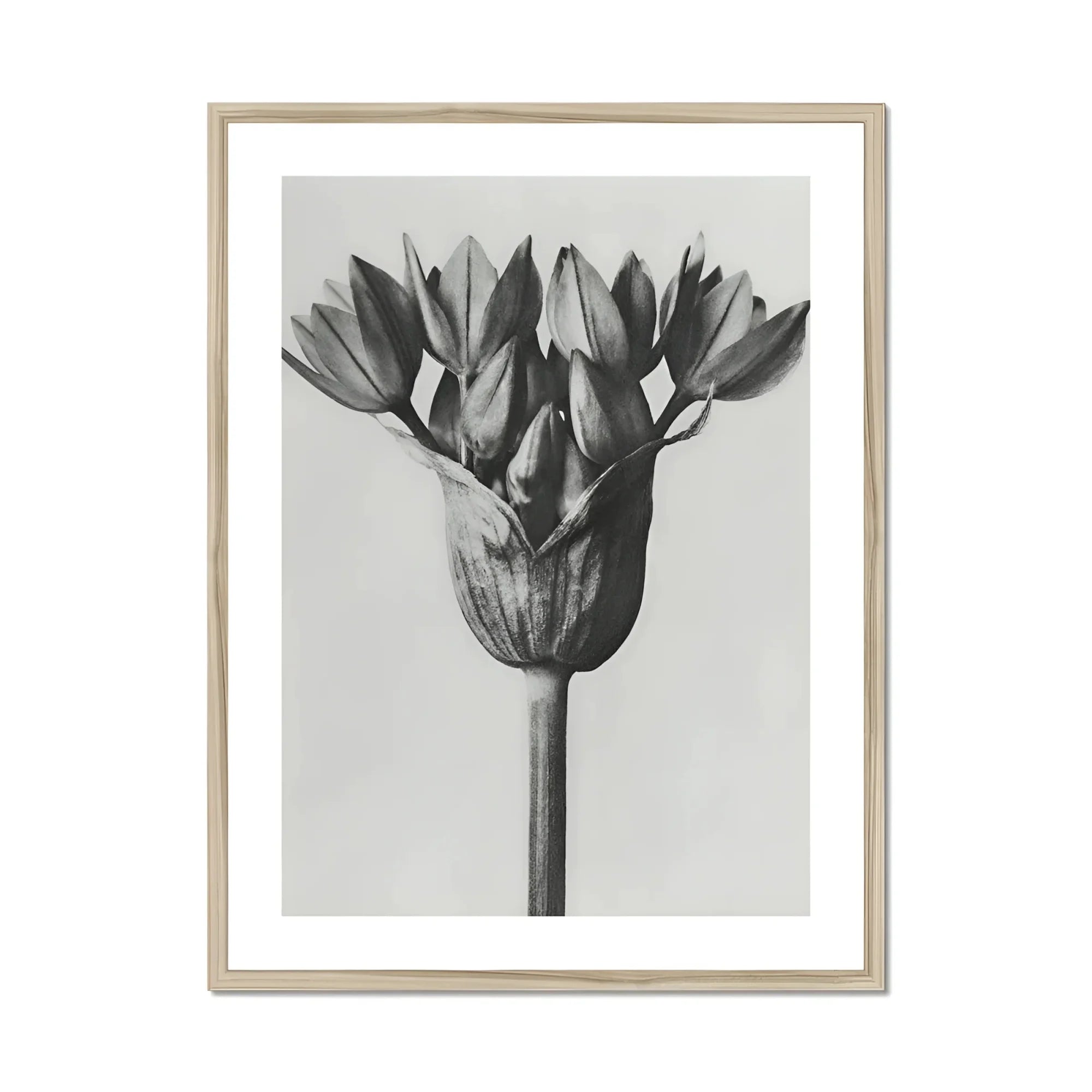 Sie blicken auf ein monochromatisches Wunder – Karl Blossfeldts akribische Aufnahme des Allium Ostroroskianum, oder Zierlauch. Und dieser feine Kunstdruck enthüllt die verborgene Geometrie der Natur in scharfem Schwarz-Weiß und verwandelt die bescheidene Zwiebel in ein skulpturales Wunder.