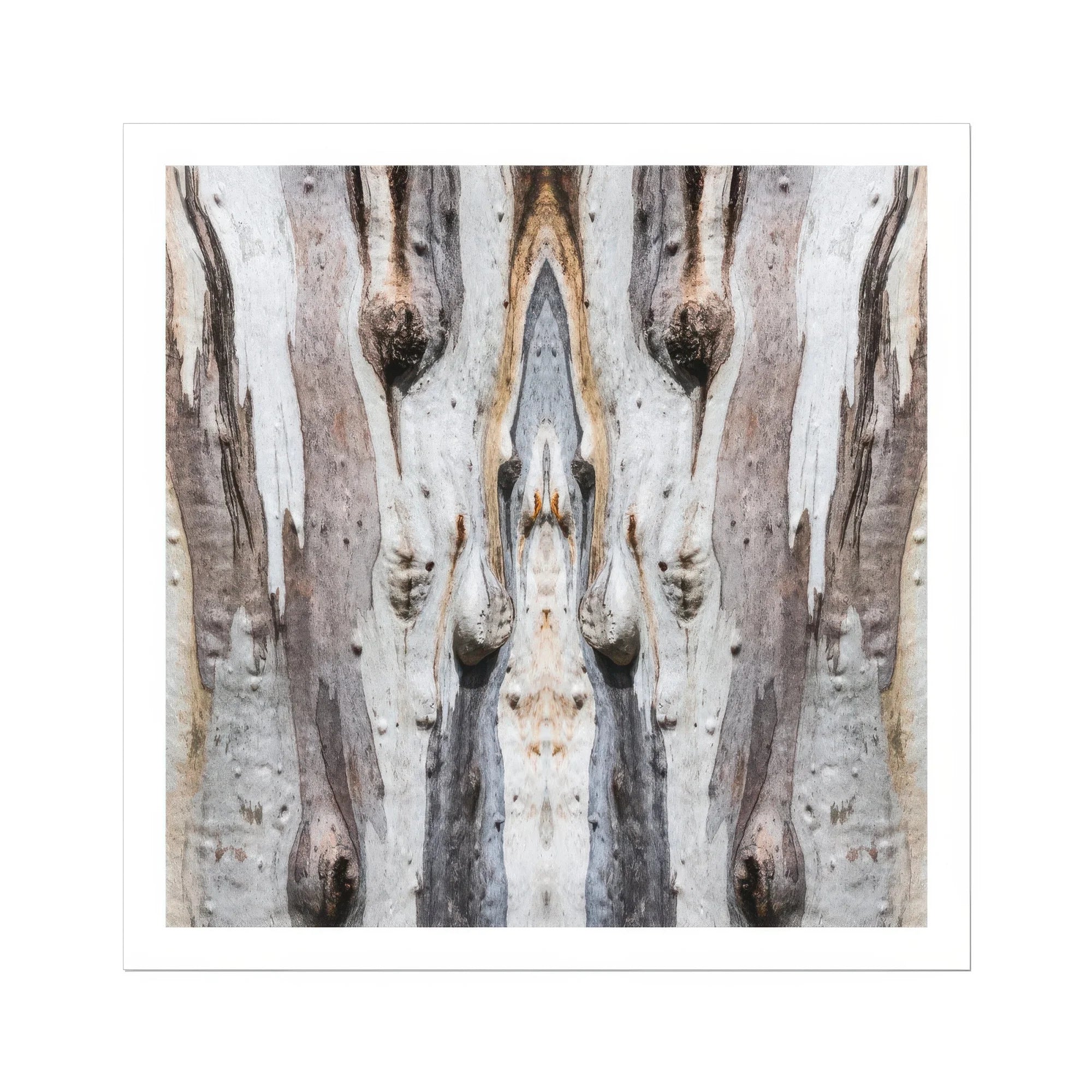Die auffällige Symmetrie von Barking Mad zeigt ein Spiegelbild von Baumrinde und schafft eine abstrakte, fast totemartige Komposition. Der zentrale Fokuspunkt ähnelt einem verlängerten Pfeil- oder Speerspitze und zieht den Blick nach oben. Flankiert wird diese zentrale Form von strukturierten Mustern der Rinde, die Knoten und organische Erhebungen aufweisen und ein Gefühl von Tiefe und Charakter erzeugen.