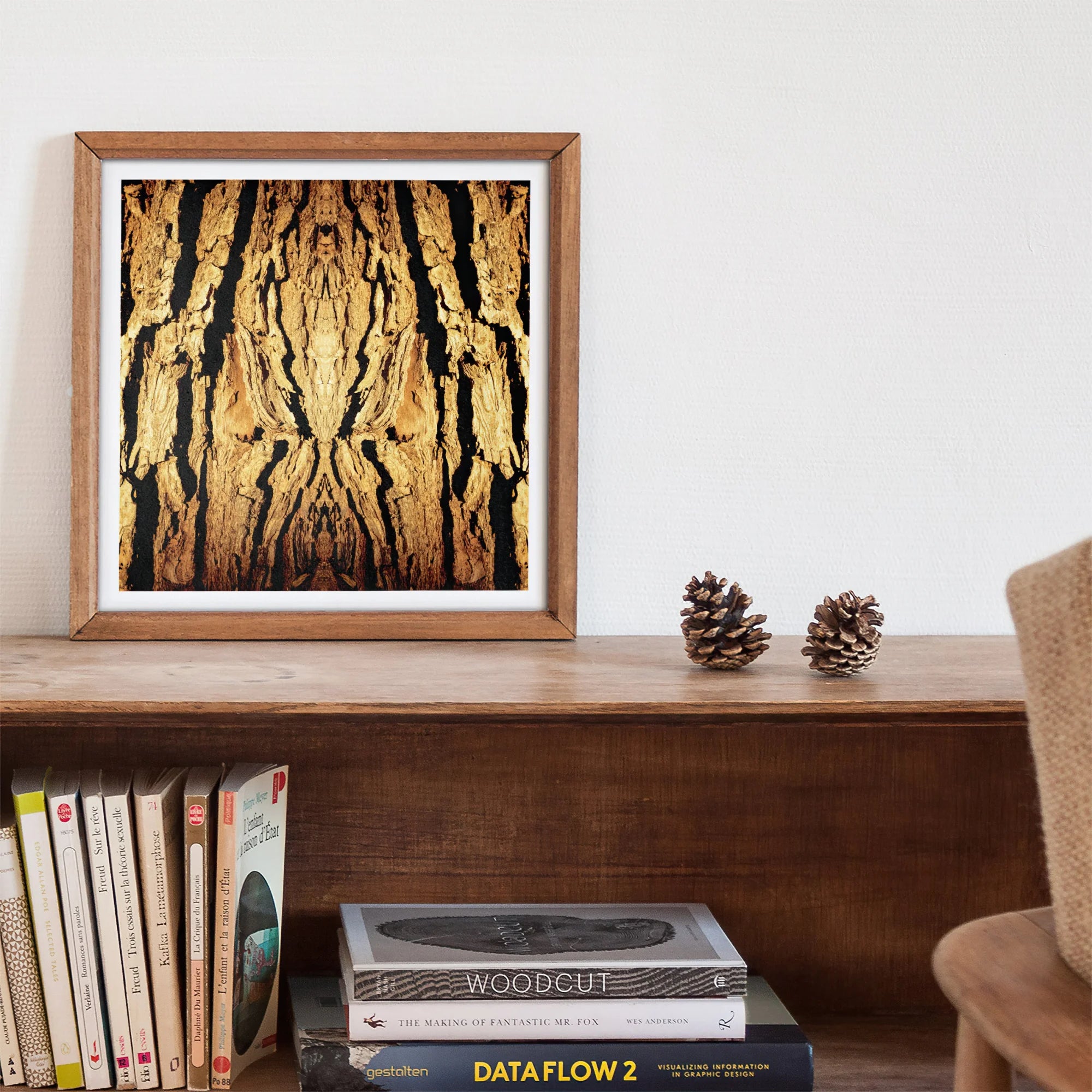 Die komplizierten Muster, die in reichen Erdtönen aus braunen, goldenen und subtilen Umbers gerendert werden, zeigen den verborgenen Charakter dieses Baumriesen. Knoten und Rindentexturen erzeugen eine fast mystische Wirkung, die den rohen, ungezähmten Geist der australischen Wildnis hervorruft.