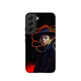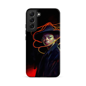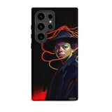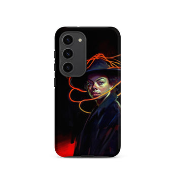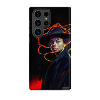 Ihr Blick hält das Gewicht von neu geschriebenen Ritualen, eine queere Magie, die in Schatten und elektrischem Glanz getränkt ist. Die Falten des Umhangs vertiefen sich zu einem Fast-Sturm, der das rote Aufflackern darunter verschlingt, als wäre der Boden selbst in Flammen. Jede Kontur wirkt absichtlich, ein Zauber in Farbe gezeichnet, von der Ockerverbrennung entlang ihrer Wange bis zu der Leere, aus der sie tritt.