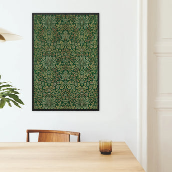 Während Sie die rhythmische Wiederholung der stilisierten Flora aufnehmen, werden Sie zum Höhepunkt der Arts and Crafts-Bewegung transportiert. Dieses Stück dekoriert nicht nur; es verwandelt Ihren Raum in ein kuratiertes Heiligtum der Ästhetik des 19. Jahrhunderts. Der schwebende Rahmen verstärkt die Tiefe der Leinwand und schafft die Illusion, in Morris' idealisierten englischen Garten zu blicken.