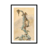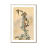 Sein Körper wölbt sich in der Mitte der Drehung, ein Schwert baumelt in einer Faust, Medusas Kopf schlaff in der anderen. Jede Locke des Schlangenhaars ist mit Details verstopft; der Ausdruck der Gorgone, im Tod schlaff, spiegelt die Stille wider, die auf eine Katastrophe folgt. Unter ihm liegt ihr Leichnam ausgestreckt, verdreht wie weggeworfener Stoff, der seiner Macht beraubt ist, aber dennoch den Moment mit unausgesprochener Schwere verankert.