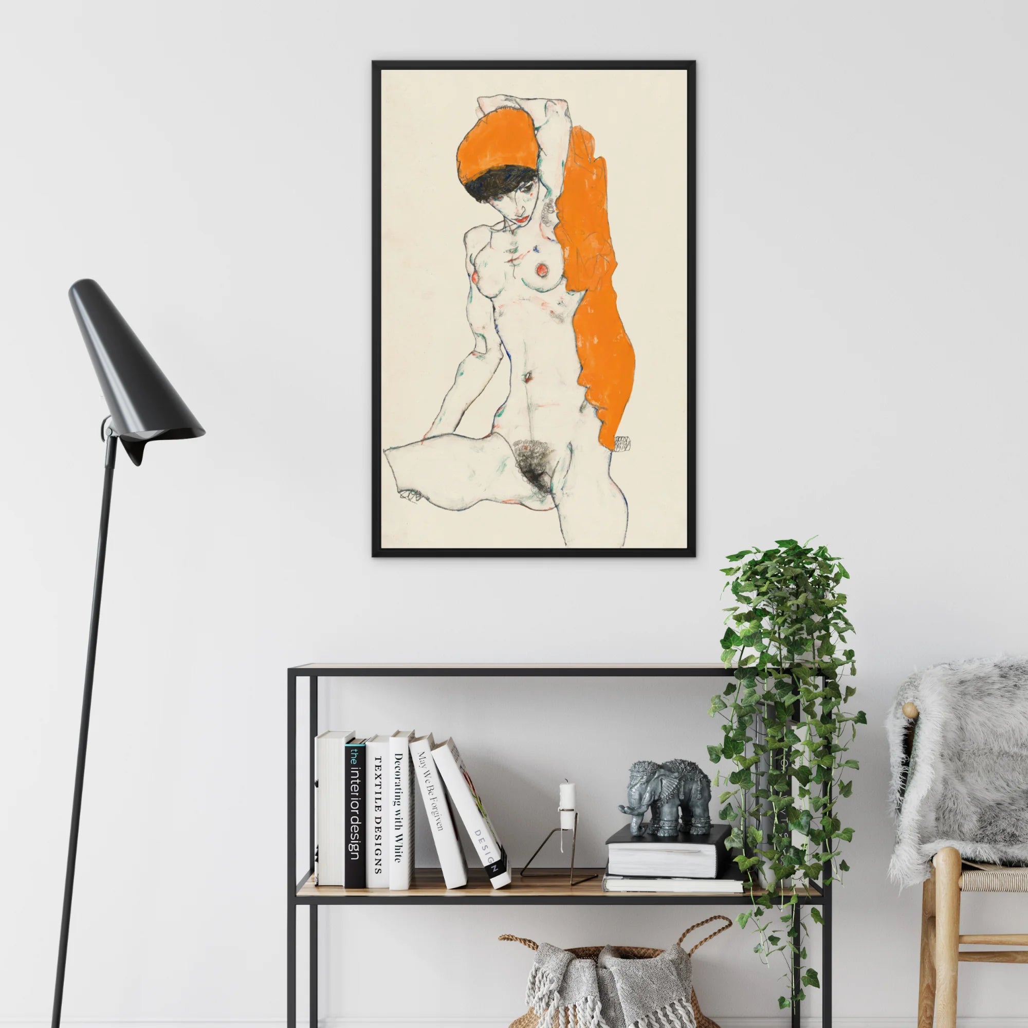 Verlieren Sie in der Rohesusualität von Egon Schieles "Nude mit Orangenvorhaupt" von Egon Schieles gerahmte Leinwand. Dieses provokative Meisterwerk zeigt Schieles markenartiger expressionistischer Stil mit seinen verdrehten Körperformen und intensiven Linien.