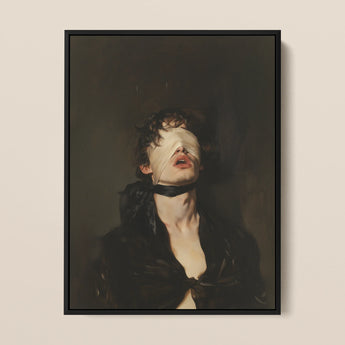 Mit tiefen, malerischen Strichen gefertigt, verwandelt dieses Kunstwerk den Raum selbst—durchdringt ihn mit der rohen Anziehungskraft der blind gefesselten Unterwerfung, der Spannung unerfüllter Sehnsucht, der geladenen Stille zwischen Lust und Zurückhaltung. Es ist nicht nur ein gerahmter Druck; es ist eine Beschwörung, eine Szene, die zwischen Macht und Freigabe schwebt.