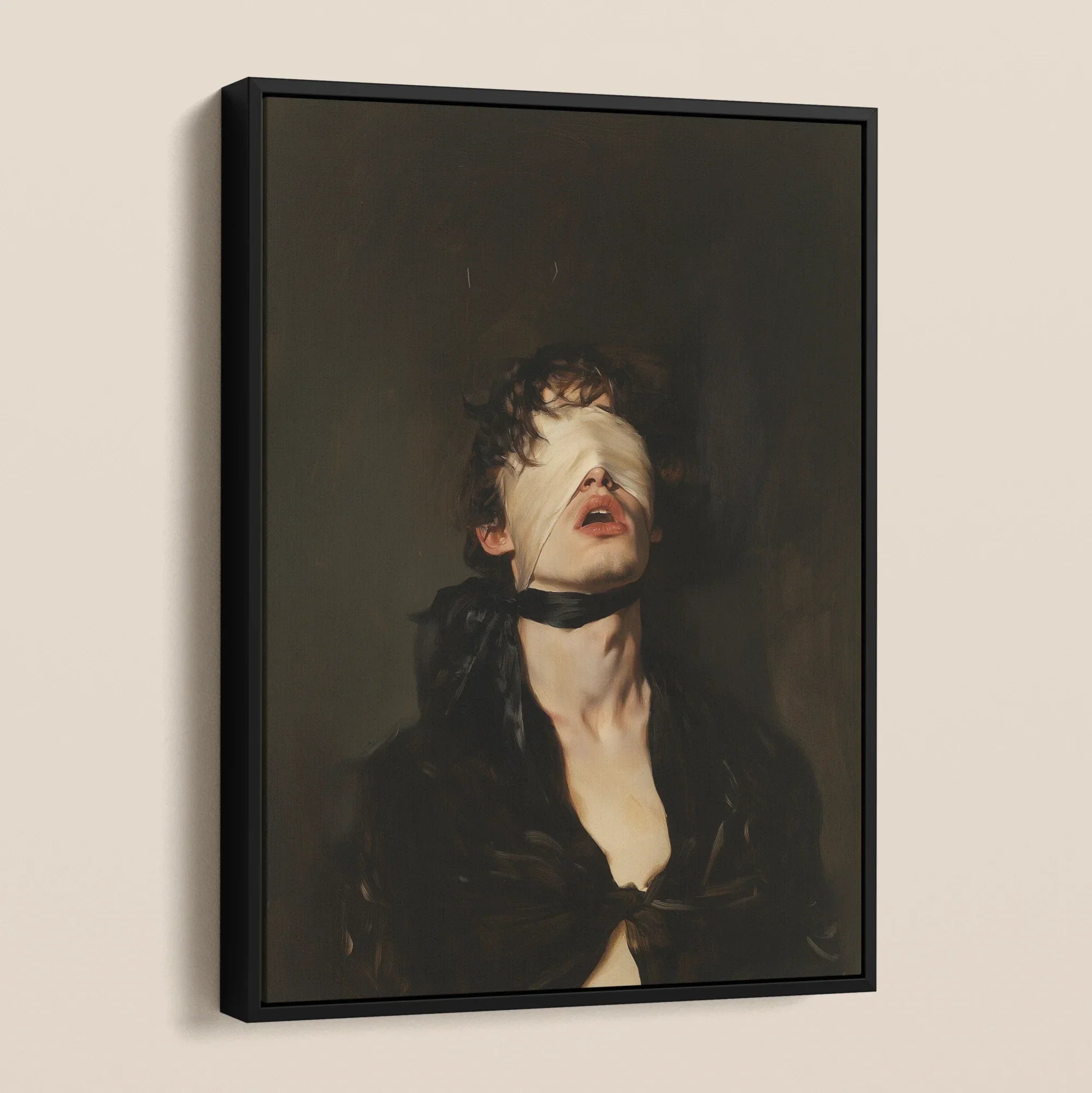 Diese gerahmte Leinwand ist mehr als Dekor—sie ist eine Konfrontation, eine Rückeroberung. Die Chiaroscuro-Beleuchtung modelliert seine Form mit dramatischer Intensität, die Caravaggios homoerotische Untertöne widerspiegelt und gleichzeitig die dunkle Sinnlichkeit der zeitgenössischen BDSM-Fotografie umarmt. Hier ist sensorische Deprivation kein Verlust, sondern eine Befreiung, ein Vertrauensfall ins Unbekannte, eine intime Hingabe an Dominanz, Fetisch und Verlangen.