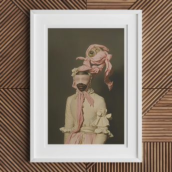 Die rosa Schärpe entrollt sich—fließend, rebellisch—als ob sie sich an das sanfte Gewicht des zeremoniellen Gele und die trotzige Haltung derer erinnert, die sie sowohl in Feier als auch im Überleben trugen. Keine passive Verzierung, diese Seide erhebt sich zu einem skulpturalen Seidengewand. Ein barockes surrealistisches Kopfstück, das sich der Logik der Schwerkraft widersetzt. Gekrönt von einem einzigen vergoldeten Auge. Beobachtend—aber nicht urteilend. Zeugnis ablegend. Eine neo-barocke Stilgeste: auf eigenen Bedingungen zu sehen und gesehen zu werden.